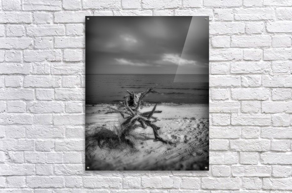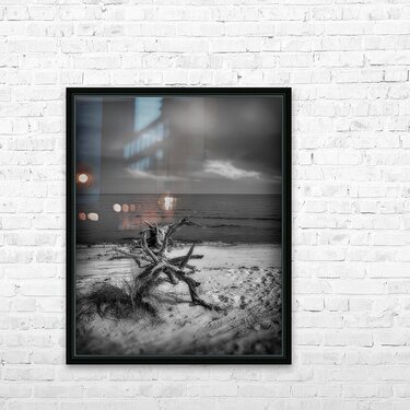 As the storm clouds gathered ominously overhead I found myself drawn to the rugged beauty of Bald Point State Park. Despite the dark and stormy weather there was an undeniable allure to the untamed wilderness that beckoned me to explore its secrets. As I ventured deeper into the park the sound of crashing waves grew louder signaling my approach to the coastline. With each step the wind whipped through the trees and the air was heavy with the scent of salt and sea spray. Eventually I emerged onto a secluded stretch of beach where the storms full force seemed to be unleashed. Standing before me was a scene straight out of a painting—a dramatic moody seascape captured in black and white. In the foreground a weathered tree trunk with protruding branches stood sentinel against the raging elements. Its gnarled form spoke of years of enduring the harsh coastal conditions a silent witness to the passage of time. Beyond the tree the sandy beach stretched out towards the calm sea its surface undisturbed by discernible waves. The horizon line blurred into the darkened sky textured with clouds ranging from soft wisps to ominous formations. The absence of color in the photograph heightened the scenes intensity focusing my attention on the raw beauty of natures elements. Despite the storms fury the landscape had a serene and timeless quality that filled me with a sense of awe and reverence. As I stood there surrounded by the untamed wilderness of Bald Point State Park I couldnt help but feel humbled by the power and majesty of the natural world.