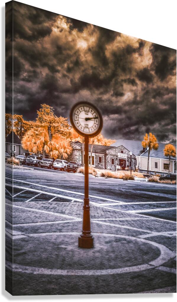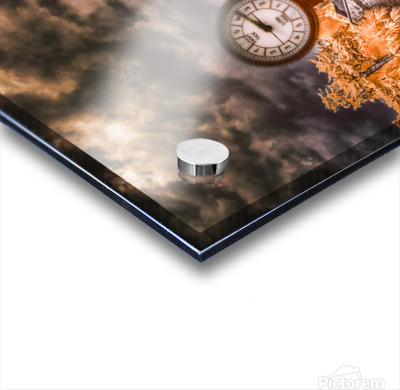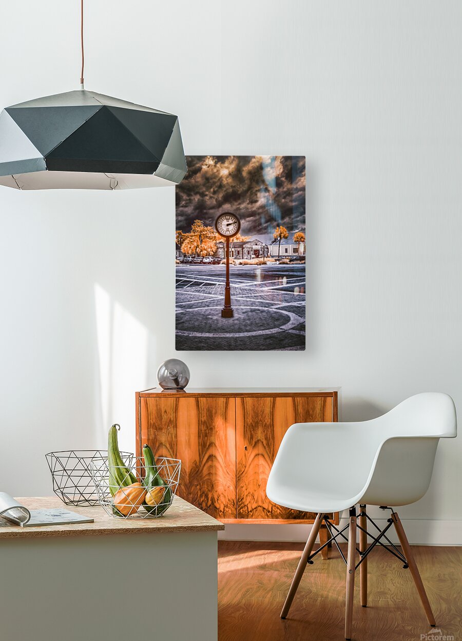 A street clock set against a colorful surreal landscape