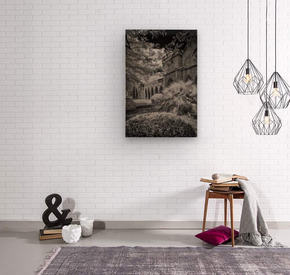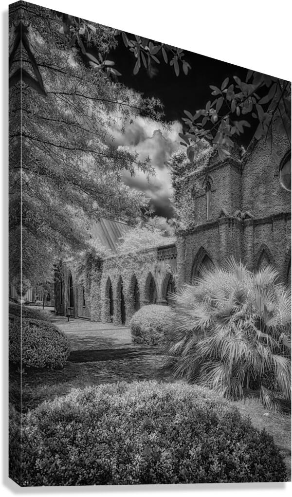 Immerse yourself in the timeless allure of St. James Episcopal Church in the heart of Eufaula Alabama unveiled through the lens of a captivating black and white infrared photograph. This visual journey transcends the ordinary inviting you into an enchanting embrace where the very soul of the church is laid bare. The ivy-covered walls adorned with intricate details become a living canvas as they gracefully unfold in monochromatic splendor. Each tendril of ivy tells a story weaving a tapestry of textures that adds an ethereal elegance to the scene. The play of light and shadow accentuates the architectural nuances bringing forth the churchs history and character in a silent visual symphony. In the foreground a small bush stands as a humble yet significant presence contributing to the composition with its delicate silhouette. Against the stark black sky a dramatic backdrop unfolds serving as a canvas that accentuates the ethereal beauty of St. James Episcopal Church. The dark expanse magnifies the intricate details creating a chiaroscuro effect that heightens the overall atmospheric impact. Nature seemingly with artistic intent positions the surrounding trees to frame the entrance of the church. Their branches extend like welcoming arms adding a touch of mystique to this atmospheric portrayal. The juxtaposition of natural elements against the architectural grandeur creates a harmonious balance transforming the photograph into a visual poem. As you step into this enchanting visual narrative the very spirit of St. James Episcopal Church comes alive. The black and white infrared treatment not only captures the physical form of the church but also reveals its intangible essence. It becomes a portal into a realm where time seems to stand still and the delicate dance of light and shadow narrates the sacred stories etched within the hallowed walls.
