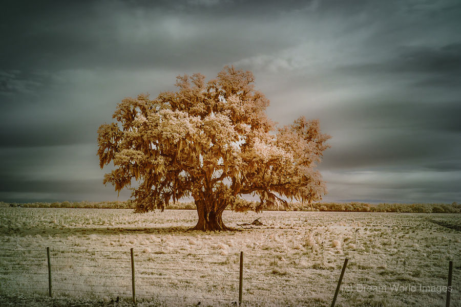 Where Spanish moss dances with copper light a lone oak writes its story across the sky. Through infrareds enchanted lens centuries of strength transfo...[+]