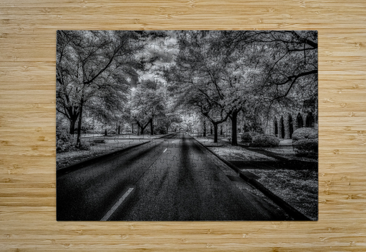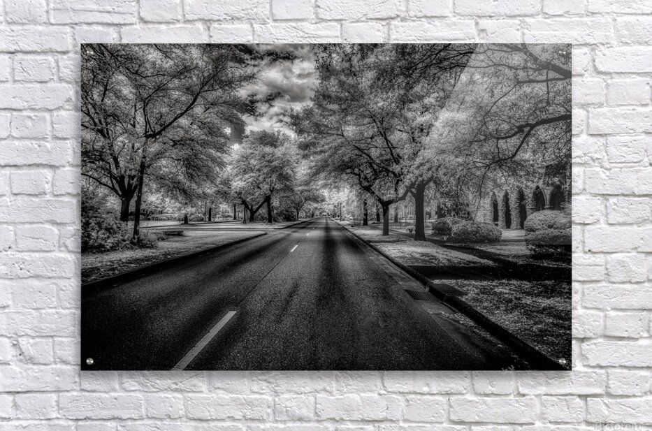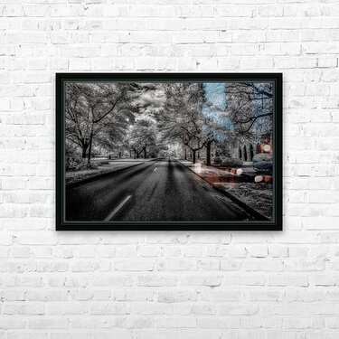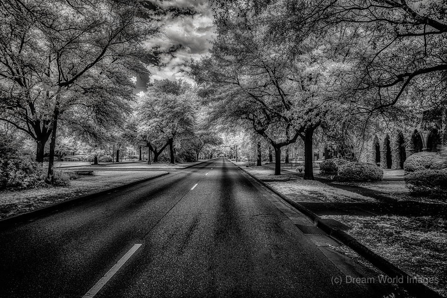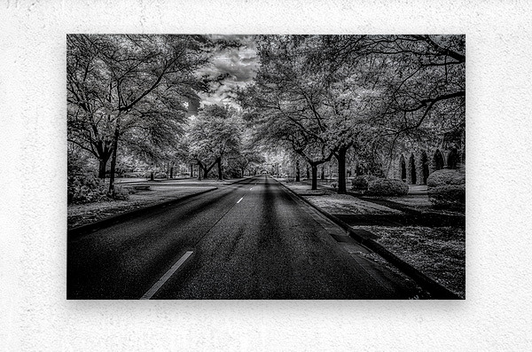 During our meandering drive through the charming streets of Eufaula Alabama my wife and I stumbled upon a visual marvel that begged to be captured. The historic town steeped in Southern elegance unfolded before us like pages from a bygone era. The main drive embraced by majestic oak trees beckoned us to immerse ourselves in its timeless charm. Stopping to savor the moment I set out to encapsulate the essence of Eufaula in a single frame. The result was a black and white infrared masterpiece a photograph that transcends the ordinary and unveils the towns soul. Titled Eufaula Elegance: A Monochromatic Journey Through Time the image captures the iconic drive framed by ancient oaks their branches forming a natural arch over the road. The magic of infrared photography lent an ethereal quality to the scene accentuating the crisp details of the architecture and the textured elegance of the overhanging oaks. As the infrared wavelength unfolded its unique narrative the towns history seemed to echo through the branches whispering tales of days long past. The play of light and shadows brought forth a captivating chiaroscuro effect rendering each detail with a poetic grace. The architectural gems along the drive stood as silent witnesses to the passage of time their stories unfolding in the monochromatic tapestry of the photograph. Eufaula Elegance is not merely a picture its a time-traveling experience an invitation to stroll through the corridors of history. It serves as a visual ode to a town where every cobblestone and every oak leaf has a story to tell—a story now preserved in the elegant dance of light and shadows.