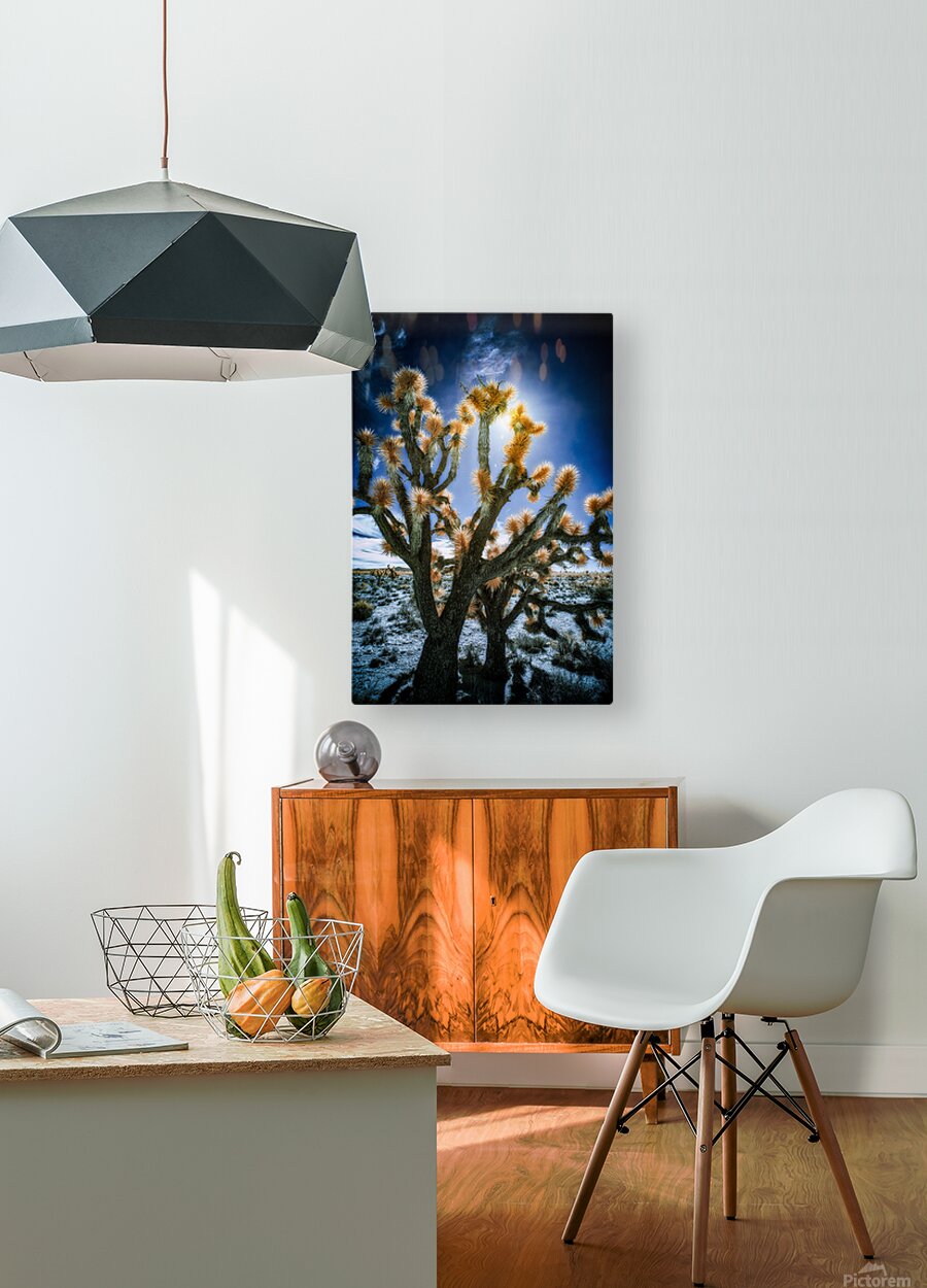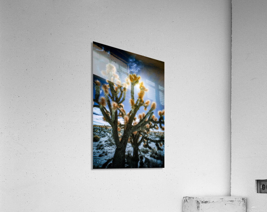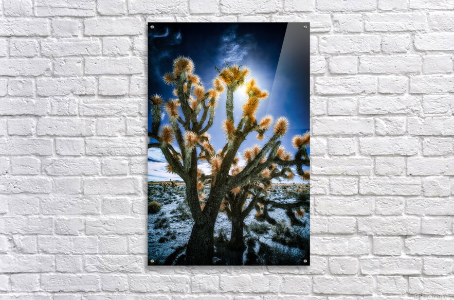 Celestial Glow Through Joshua Limbs is an enigmatic visual journey into the heart of an ethereal desert landscape. This striking photograph encapsulates the mystical allure of a desert scene where the towering silhouettes of Joshua trees rise against a vibrant nearly surreal backdrop. The composition is meticulously crafted to highlight the arresting contrast between the stark shadowed forms of the trees and the luminous needle-like plumes that radiate with an almost celestial brightness. The sun artfully positioned at the core of the scene casts an otherworldly glow that permeates the image intensifying the rich tapestry of colors and textures. A deep blue sky serves as the enthralling canvas enhancing the otherworldly atmosphere of the piece. This photograph not only captures the unique spiny contours and surreal beauty of the Joshua trees but also invites the viewer to ponder the hidden energies swirling amid their ancient limbs. An aura of mystery envelops this artwork drawing you into a dreamscape where time and space blur and the raw essence of the desert is unveiled in its most dazzling form. The interplay of light and shadow beckons you to explore the profound secrets that lie within offering a glimpse into a world where the ordinary dissolves into the magical.