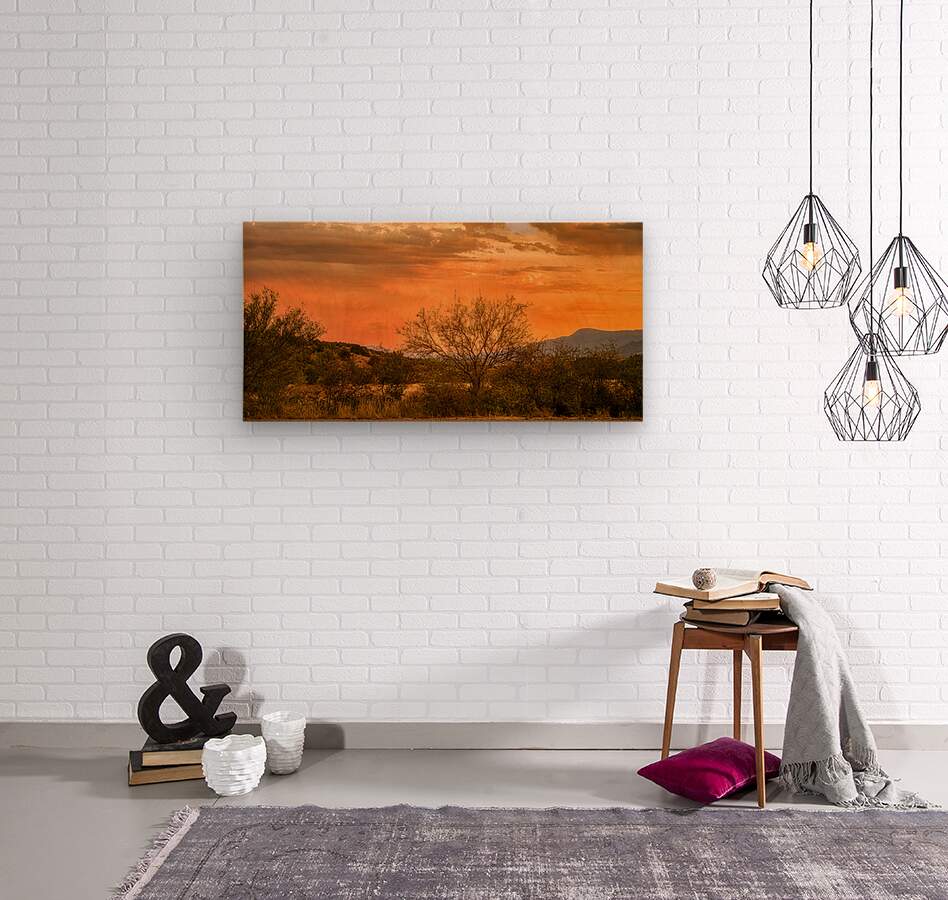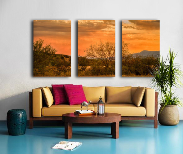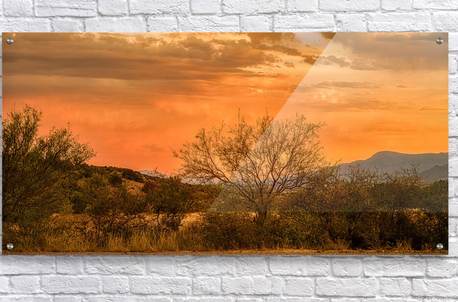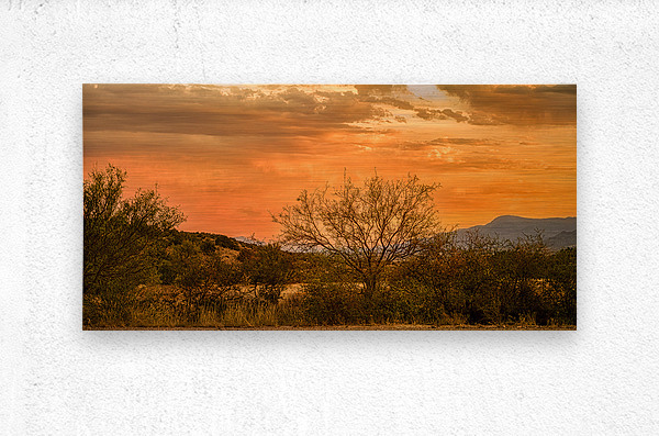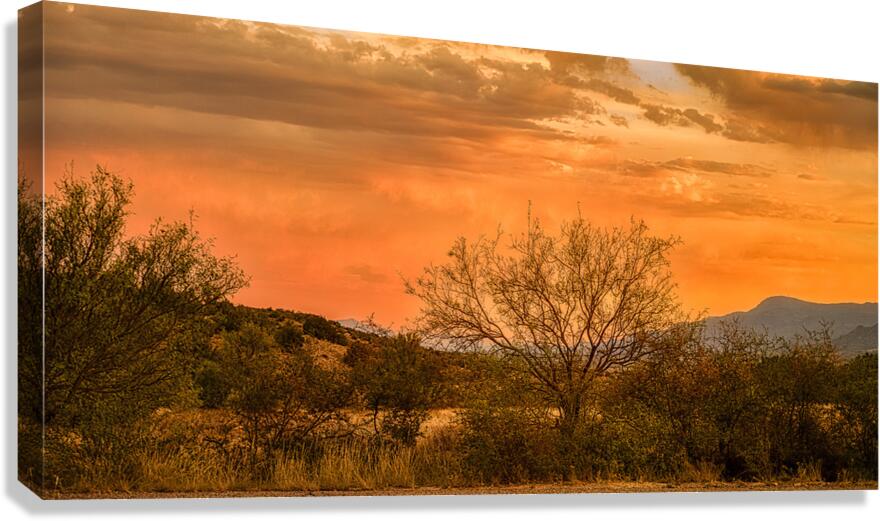 As my wife and I were driving back from the store in Cottonwood Arizona the sky started to light up in the most breathtaking way. We couldnt resist pulling over onto a dirt road to capture this moment. Behold a mesmerizing oasis of tranquility where time seems to linger in an eternal calm. This captivating photograph unveils a desert landscape bathed in the soft embrace of a setting sun. The sky above is a masterpiece of celestial artistry a gradient tapestry painted with enchanting hues of orange pink and blue. Wisps of clouds meander gently across the horizon whispering secrets carried by the dusk. In the foreground sparse desert vegetation subtly anchors the scene. A lone tree stands as a sentinel its silhouette etched against the vibrant twilight offering both contrast and harmony. The undulating contours of distant hills weave a gentle rhythm inviting the viewer to explore the vastness and depth of this serene sanctuary. As day gracefully yields to night this image captures not just the play of light and shadow but the essence of a landscape at peace with itself—a moment when natures serenity speaks to the soul unveiling mysteries often overlooked. Allow yourself to be drawn into this enigmatic dance of colors an experience as ephemeral as the desert breeze yet as enduring as the whispers of the dunes.