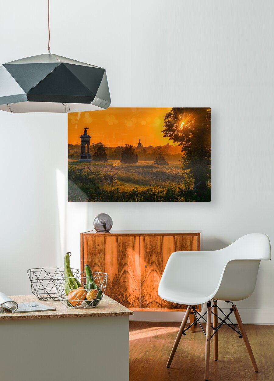 In the golden haze of dawn, Gettysburg's hallowed ground reveals its timeless story. A distant church steeple pierces the morning mist while sunbeams paint the battlefield in ethereal amber tones. This magical moment transforms the historic landscape into a meditation on sacrifice and peace, where nature's daily tribute bathes these sacred fields in reverent light. Part of the "Hallowed Dreams" collection, this image captures the delicate balance between remembrance and renewal on this hallowed soil.