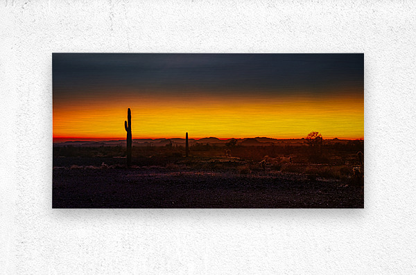 In the sacred moments when day surrenders to night, I discovered this ethereal performance in the Sonoran Desert. Through my lens, the sky ignited into a band of liquid amber, as if nature herself had drawn a glowing horizon between earth and heaven. Sentinel saguaros, those ancient guardians of desert dreams, stand in silhouette against this celestial canvas, their arms raised in eternal praise to the dying light. The transition between day and night creates a perfect stage where light performs its final act of the day. Like nature's own theater, the desert floor darkens to deep purple while above, the sky holds onto one last breath of golden light. Each cactus becomes a character in this daily drama, their distinctive shapes telling stories of survival and patience against the backdrop of nature's most spectacular light show. Some say the desert reveals its deepest secrets in these fleeting moments between light and shadow. On this evening, as the sun painted its farewell across the sky in impossible shades of amber and indigo, I witnessed one such revelation. This isn't just a sunset - it's a reminder of the desert's ability to transform from harsh reality into pure magic when the light falls just right.