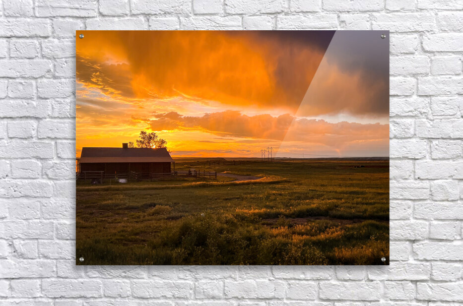 A breathtaking Montana sunset ignites the prairie sky in a blaze of amber and gold, where weathered barn and rustic fences stand silhouetted against n...[+]