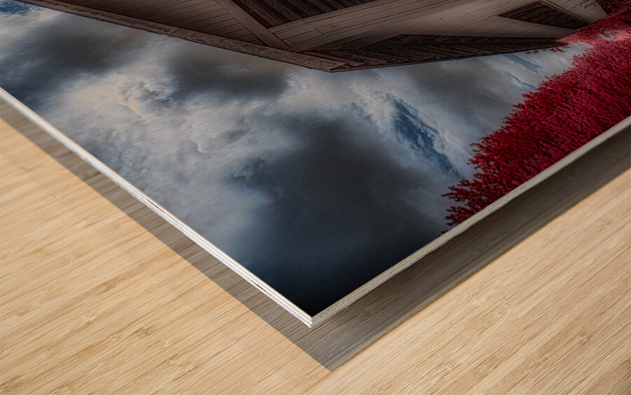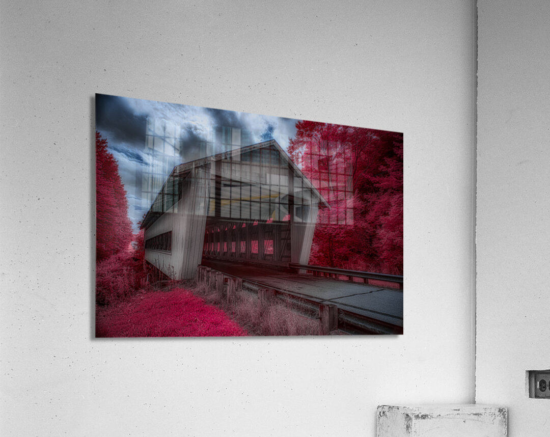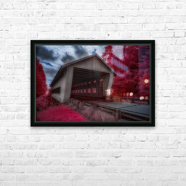In the haunting and fantastical realm of this artwork a dramatic and surreal covered bridge emerges as the central beacon. Its wooden structure laden with distinct lines and intricate trusses stands as a testament to timeless architecture. The bridge bathed in ethereal shadows contrasts starkly with its vibrant surroundings—a sea of red foliage pulsating with life. The sky above is a tapestry of heavy clouds adding a moody ambiance that envelops the scene in an almost otherworldly embrace. The intense contrast of colors—fiery reds against the somber hues of the bridge and the brooding sky—creates an enigmatic dreamlike quality drawing viewers into a surreal experience that transcends ordinary perception. This artwork’s unique color palette not only enhances its mystical allure but also casts a spellbinding effect turning the passage of the bridge into an ethereal journey. The spectral landscape thus becomes a conduit to the unknown inviting one to explore the shadows and luminosity of an imaginative enigmatic world.