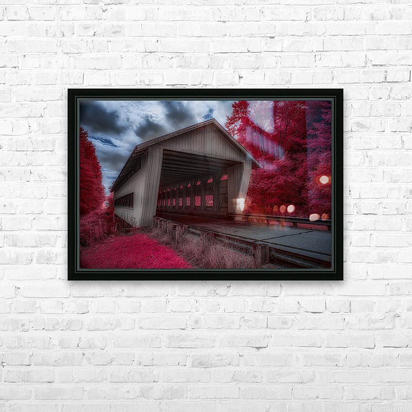 In the haunting and fantastical realm of this artwork a dramatic and surreal covered bridge emerges as the central beacon. Its wooden structure laden ...[+]