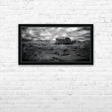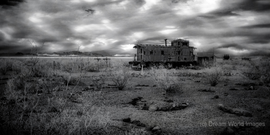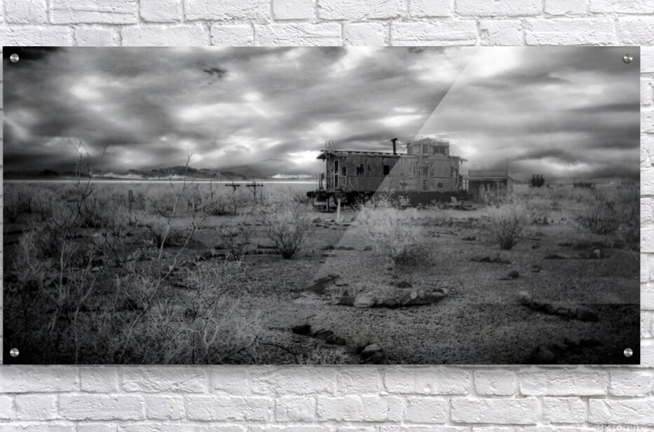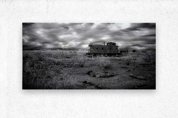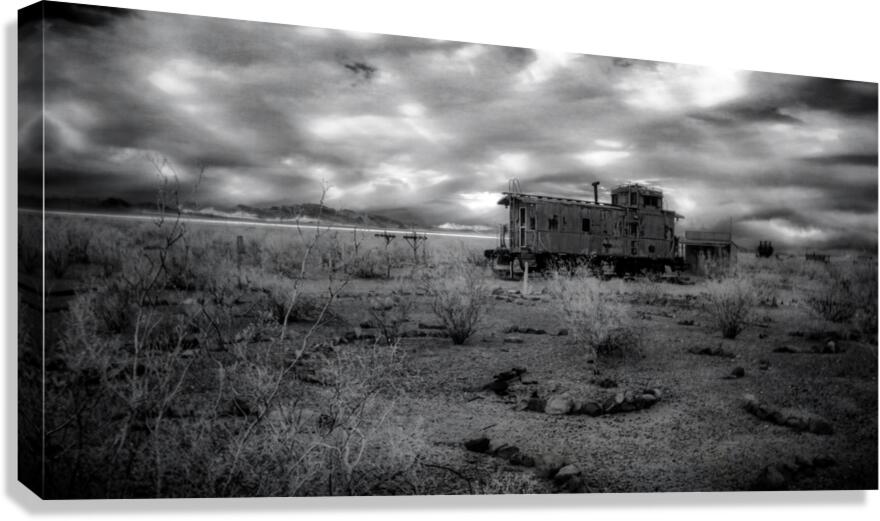 Whispers of a Forgotten Rail is a captivating black and white photograph that transports viewers to a surreal realm where time stands still. The image features a desolate landscape with a solitary weathered train car evoking stories of forgotten journeys.