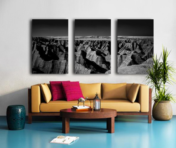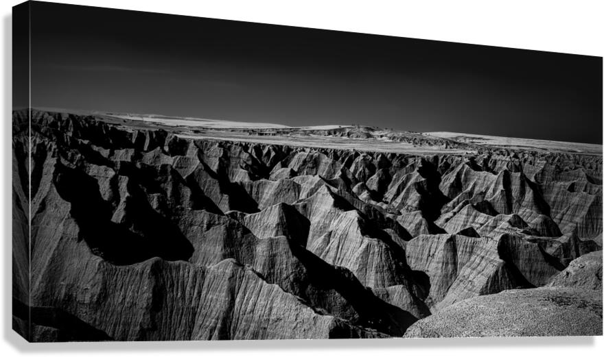 Embark on an unforgettable adventure as my wife and I journeyed through the captivating landscapes of the Badlands in South Dakota. Witness the breathtaking beauty of this rugged terrain where every shadow tells a story of mystery and intrigue. Step into a world where the shadows dance across the rugged earth revealing a landscape shrouded in enigma. The realm of sharply ridged hills and deep valleys is illuminated by a captivating play of light and shadow bringing texture and depth to every crevice. The horizon stretches endlessly beckoning the viewer to explore beyond the intricate patterns carved into the earth. In a black and white photograph that captures the essence of the lands ancient soul this artwork invites you to lose yourself in the Shadows of the Earth.