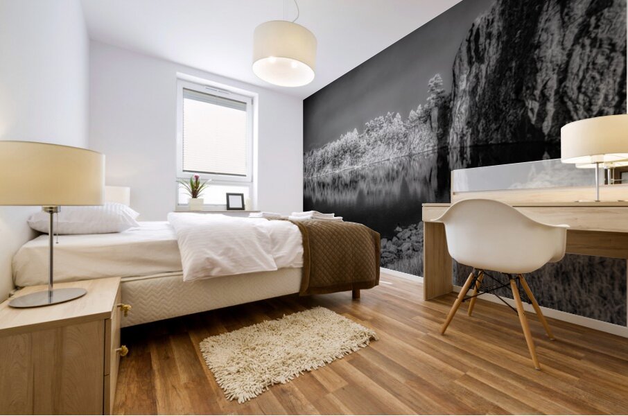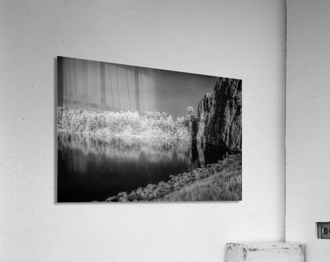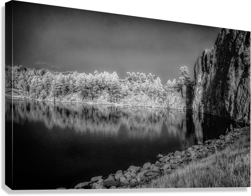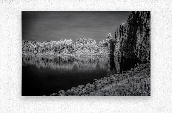 Step into a world of enchantment with this captivating piece titled Legion Reflections. The black and white photograph transports you to a tranquil oasis where natures beauty is reflected in a serene body of water. Lush trees dance along the waters edge their leaves whispering secrets of the forest. A majestic rocky cliff stands guard a silent sentinel against the passage of time. The intricate details of grasses and stones add depth to this mystical landscape inviting you to lose yourself in its enigmatic allure. Allow yourself to be transported to a place of peace and reflection as you explore the hidden depths of Legion Reflections.
