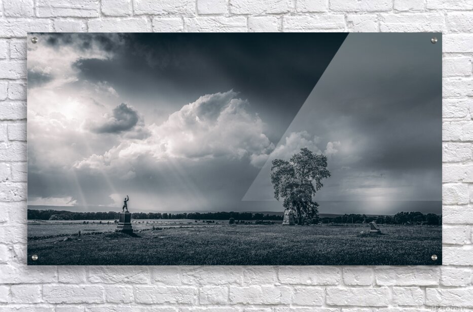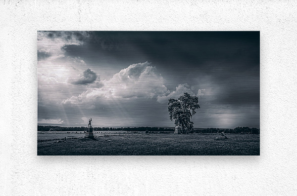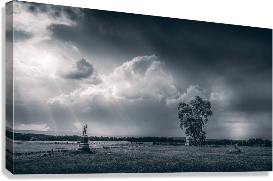 Venturing onto the hallowed grounds of Gettysburg Battlefield during a tempestuous storm stirred my soul and ignited my senses. As I braved the elements camera in hand I sought to capture the raw beauty and profound history that permeate this sacred place. After the raging storm rolled past I stumbled upon a scene that seemed plucked from the annals of time—a monochromatic landscape that spoke volumes of the past and present. The sky above churned with ominous clouds their darkened depths contrasted by ethereal sunbeams piercing through casting an otherworldly glow upon the scene. Beneath this celestial display a pastoral expanse unfolded stretching into the horizon with an air of timeless serenity. At its heart stood a solemn figure its raised arm a silent testament to the sacrifices made on these hallowed grounds. It was a monument a beacon of remembrance amidst the tranquil chaos of natures fury. Clusters of trees topped the statue their steadfast presence grounding the composition and adding depth to the vast expanse before me. Despite the storms ferocity a profound sense of peace enveloped the scene a reminder of the enduring resilience of both nature and history. As I captured this moment in time through my lens I couldnt help but feel a deep reverence for the spirits that still lingered within these fields. It was a reminder of the indomitable human spirit and the enduring majesty of nature entwined in a timeless dance of tranquility and turmoil.