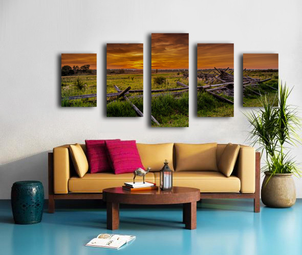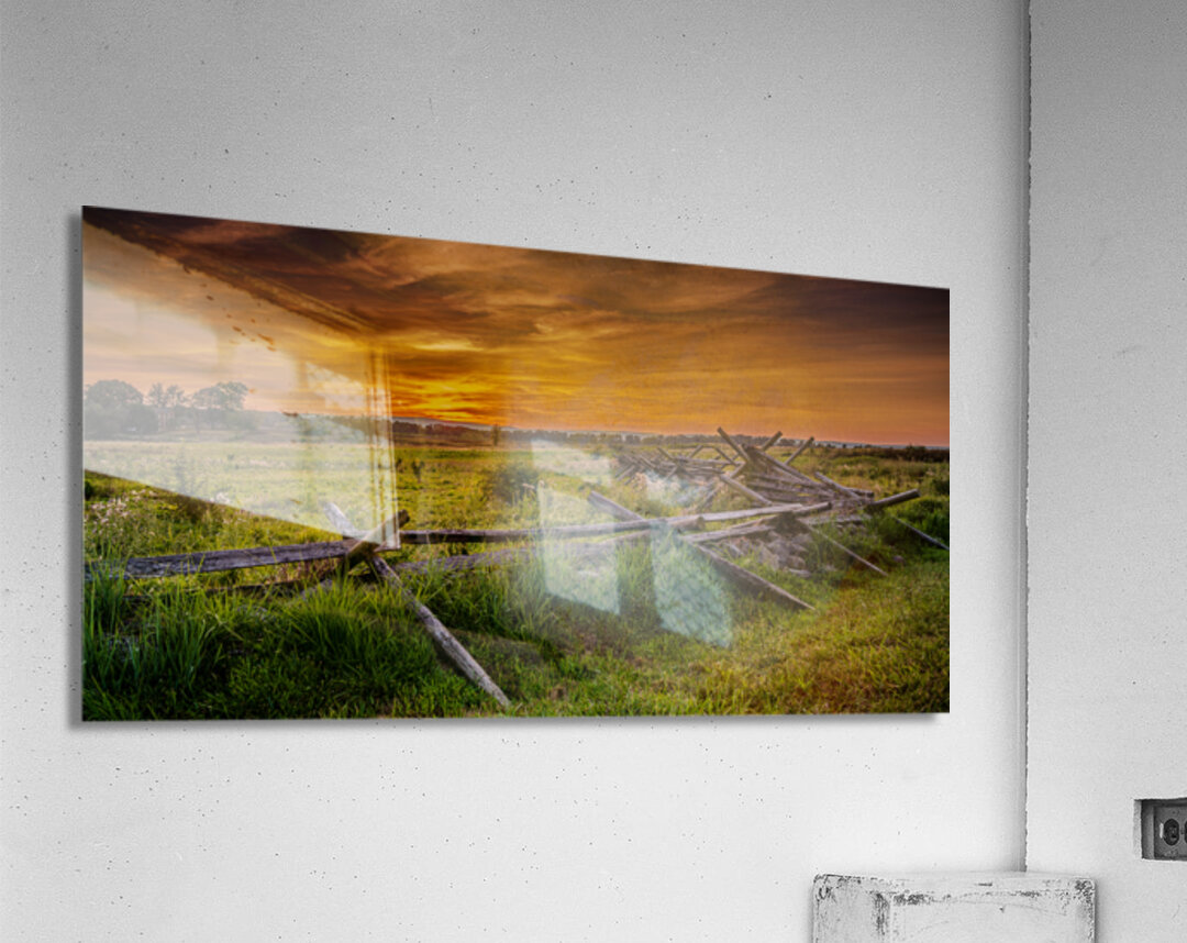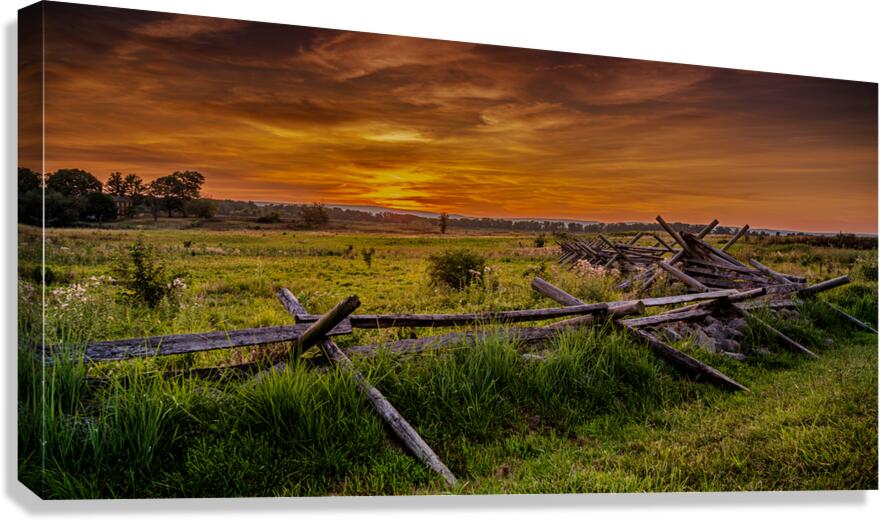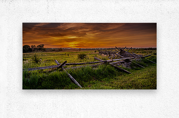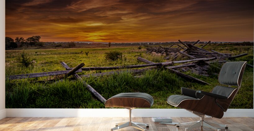 Where history meets golden hour at Gettysburg - a Civil War-era split-rail fence stands guard as nature paints the sky in flames of orange and purple. Time seems to pause here where these weathered rails have witnessed both strife and serenity.