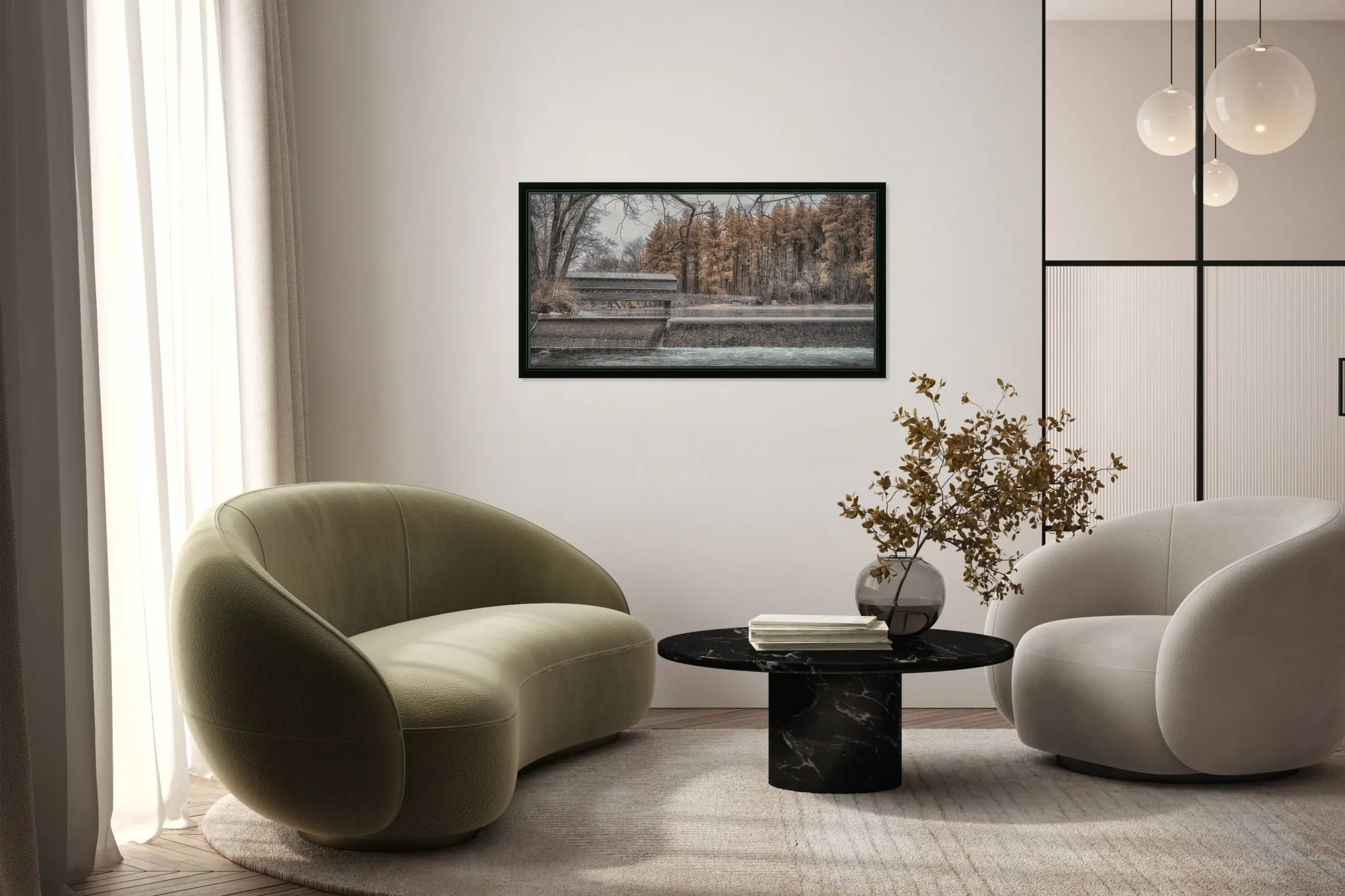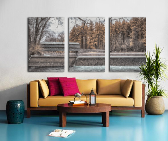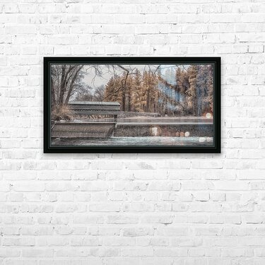 As I took a leisurely stroll around the Sach’s Bridge outside Gettysburg Pennsylvania I found myself enchanted by the serene beauty of the late winter landscape. Little did I know that my journey would lead to a captivating scene captured in an image of ethereal tranquility and otherworldly ambiance. As I ventured further into the heart of nature my eyes were drawn to a sight that stirred the soul—a covered bridge constructed from wood its triangular roof structure standing as a testament to the craftsmanship of days gone by. Spanning gracefully over a calm body of water the bridge seemed to bridge the gap between the natural and the man-made. In the foreground the riverbank cascaded gently creating a soothing melody as the water flowed over a man-made barrier. The backdrop was dominated by a copse of trees their branches bare against the overcast sky their warm bronzed tone contrasting with the cool colors of the water and the sky. Capturing the moment with my camera I felt a sense of awe and reverence for the stillness of nature that surrounded us. The images modified color palette and textured effect lent it a dreamlike quality blurring the line between reality and imagination. As I continued my walk through Gettysburgs enchanted landscape the memory of the serene scene and the timeless beauty of the covered bridge stayed with us a reminder of the quiet solitude and the profound connection between nature and the human spirit.