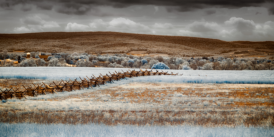 Where history meets ethereal beauty - a Civil War-era snake fence stretches across Gettysburgs hallowed ground captured in infrared to reveal winters hidden palette of copper and ice-blue hues.