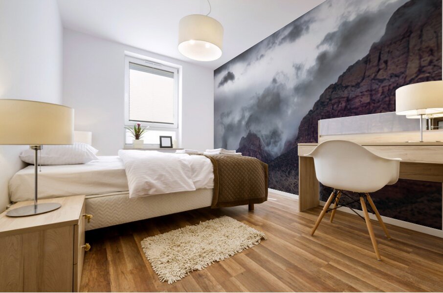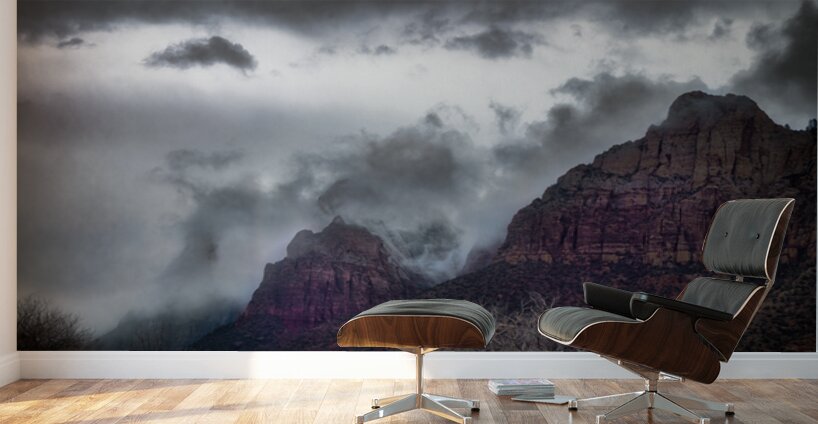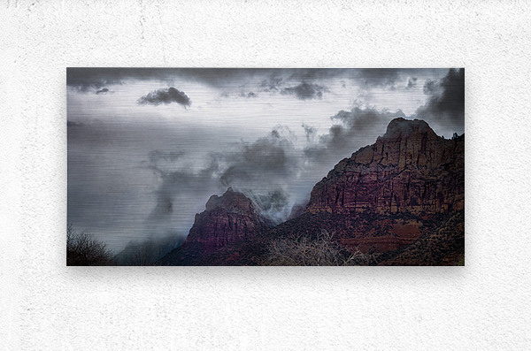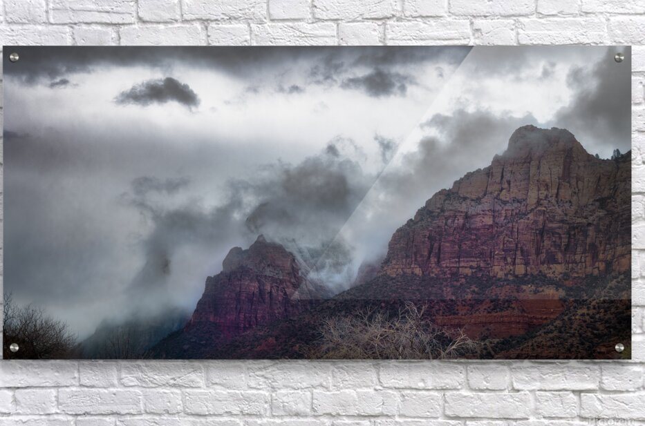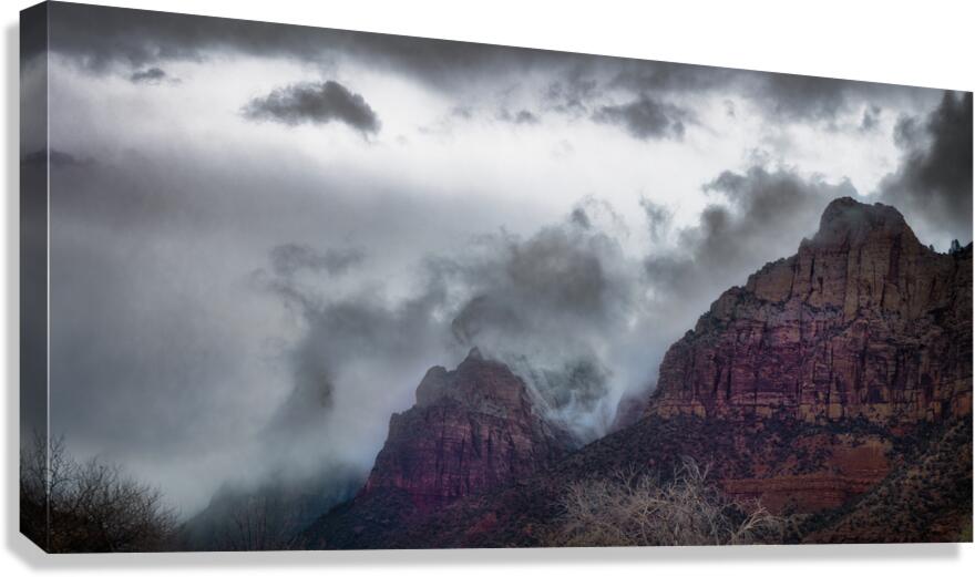 Where ancient red cliffs meet turbulent skies Zion National Park reveals its most dramatic face. Through the lens of stormy weather these towering sandstone sentinels emerge and recede as clouds perform their ethereal dance. This capture freezes a moment where natures raw power meets geological majesty creating a meditation on the eternal dialogue between earth and atmosphere.