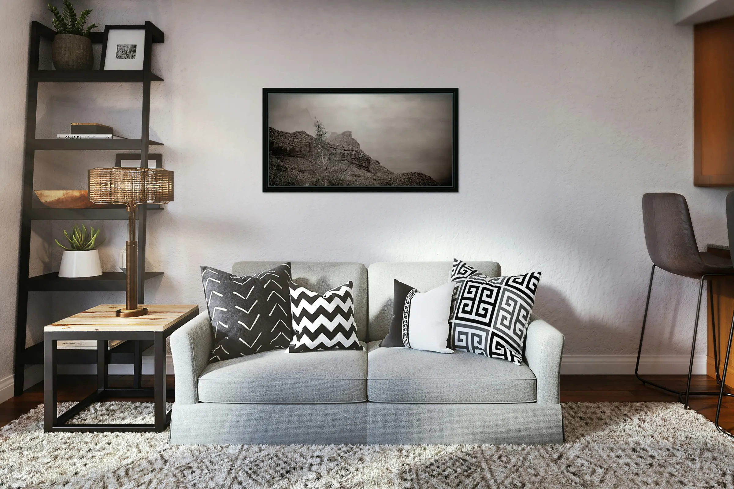 Through the lens of black and white artistry Zions ancient cliffs rise like guardians through the desert haze. Bare winter branches frame the dramatic rock face where layers of geological time are etched in stone. This contemplative study transforms Zions familiar red rock into a timeless meditation on strength and solitude where every stratum tells a story of earths patient artistry.
