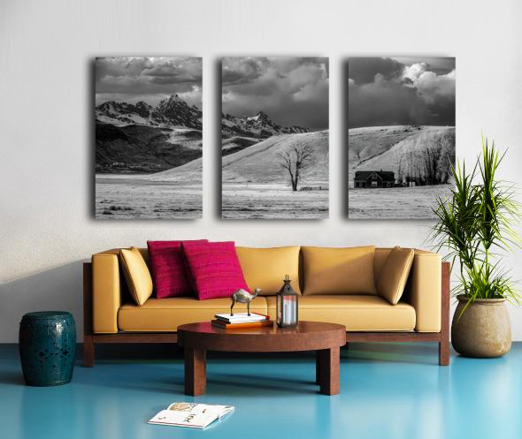 In the shadow of winter-touched peaks where mountains meet meadows I discovered this moment of perfect balance between wild and settled land. Through monochrome vision a solitary tree and humble homestead stand as quiet witnesses to natures grand theater where storm clouds gather above snow-dusted summits. The scene unfolds like a story written in light and shadow - a lone tree stands sentinel beside a rustic home their presence dwarfed by the magnificent Tetons rising beyond rolling hills. A simple rail fence traces its way across the snow-touched ground marking the delicate boundary between civilized space and wild country. Above dramatic clouds paint their own narrative across the winter sky adding depth to this tale of mountain living. Some say the truest stories of the American West are found in these quiet corners where human dwellings nestle into the feet of giants. On this day as storm light painted the landscape in infinite shades of grey I witnessed that truth. This isnt just a mountain scene - its a testament to those who choose to live in the embrace of these magnificent peaks.
