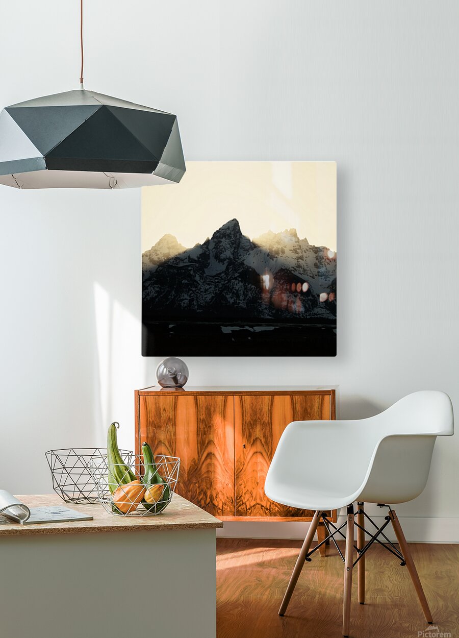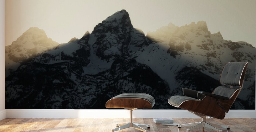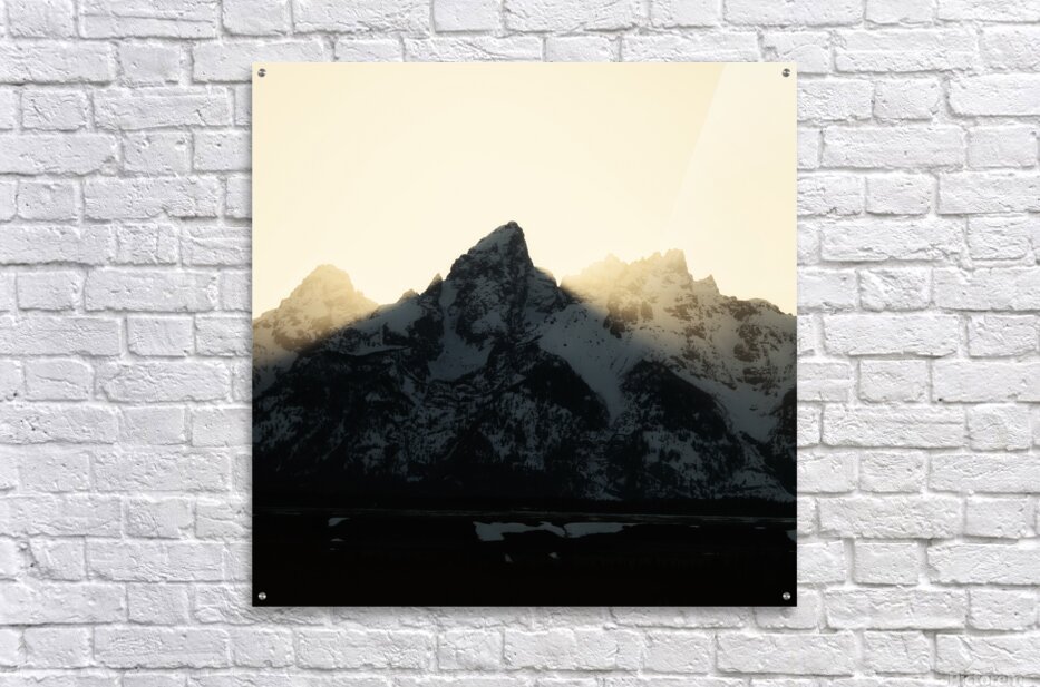 In the sacred moments when day surrenders to dusk the Tetons reveal their most profound presence. Through infrareds mystical vision these mighty peaks transform into silhouettes of ancient wisdom their snow-touched ridges catching the last whispers of light like gilded offerings to the evening sky. The Grand stands central and commanding its distinctive profile cutting a bold figure against the luminous horizon. To either side its sister peaks join in this evening ritual their forms dissolving into softer shapes as if returning to the dream-stuff from which mountains are born. The foreground falls into deep shadow creating natures own meditation space beneath these towering guardians. In the language of light and shadow that infrared photography reveals we see these familiar peaks anew - not just as geological formations but as bridges between earth and sky between the physical and spiritual realms. Each ridge and valley holds centuries of stories while the fading light paints them in tones that speak of times beyond human memory. Some say mountains are earths own prayers reaching forever skyward. In this moment between light and darkness as the Tetons stand sentinel against an ethereal sky we witness their evening devotion - a timeless ritual of shadow and light of stone and spirit of earth reaching toward heaven.