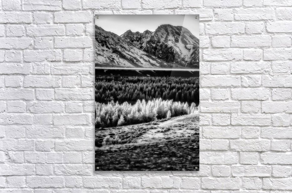 In the heart of Grand Teton National Park where light plays its daily concerto across the landscape I discovered this moment of perfect orchestration. Through infrared vision the scene unfolds in layers of luminance - a band of aspens glowing like natures own spotlight against the darker forest behind while snow-touched mountains conduct the performance from above. The composition reveals itself like a musical score written in light and shadow. The foreground sage brush creates a textured prelude leading to the brilliant crescendo of illuminated aspens. Behind them a forest of evergreens provides the deep quiet notes while the majestic Tetons rise above like natures own concert hall their snow-etched faces reflecting the days final light. Some say the most profound music is found not in sound but in the visual rhythms of nature. On this day in the Tetons as light painted its selective brilliance across the valley floor I witnessed that truth. This isnt just a mountain landscape - its natures own symphony where every tree shadow and snowy peak contributes to the silent music of light.