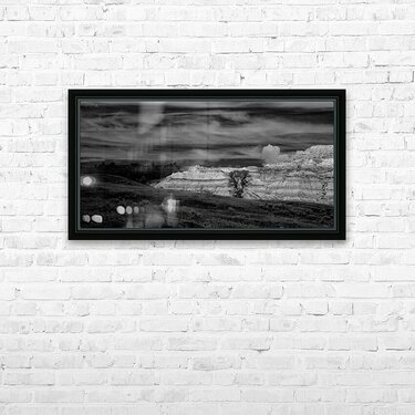 In the remote reaches of Theodore Roosevelt National Parks North Unit ancient badlands formations rise like monuments to the patience of geological time their layered walls telling stories that span millions of years. This powerful black and white composition captures the raw majesty of these sedimentary sculptures where wind and water have carved masterpieces from stone with the precision of master artists. The lone cottonwood trees nestled among the formations provide scale and life to this ancient landscape while the dramatic sky above mirrors the undulating rhythms of the earth below. Here where Theodore Roosevelt first understood the profound connection between conservation and national character we witness the same timeless beauty that inspired a president to become Americas greatest champion of wild places. These are not just rock formations - they are cathedrals of stone temples to endurance and reminders that some things are too magnificent to lose.