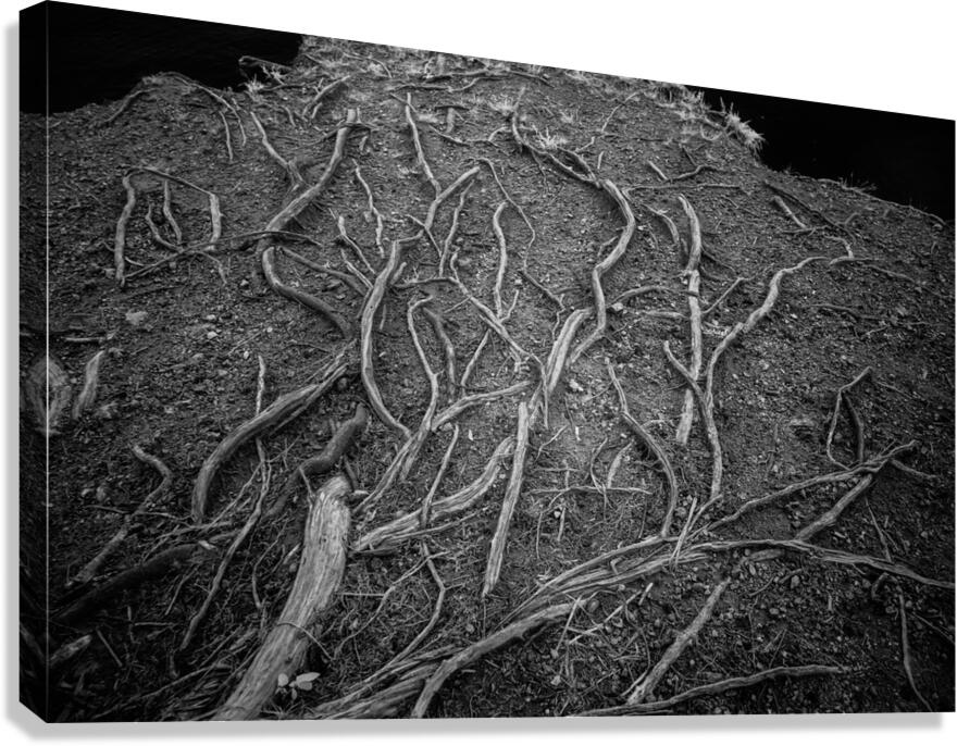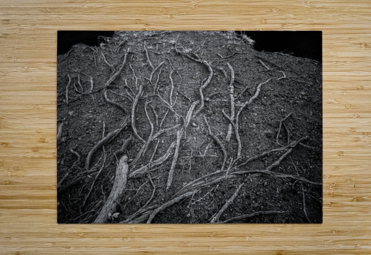 As I step into the mysterious depths of Veins of the Earth, I am entranced by the intricate dance of shadows and light surrounding me. In this captivating black and white photograph, I am greeted by the stark beauty of nature's patterns, captured in all their glory. The tree roots stretch before me, each strand varying in thickness and revealing a world unseen beneath the surface. It's as if chaos and order have come together perfectly, creating a mesmerizing display of nature's wonders. As I study the symphony of textures and details that play out against the dark earth, I feel compelled to explore further, to delve deeper into the hidden depths of the natural world. With each step, I am drawn closer to the earth's soul, eager to uncover its secrets. Veins of the Earth offers a mesmerizing glimpse into this enigmatic and mystical realm, inviting me to lose myself in its beauty and wonder.