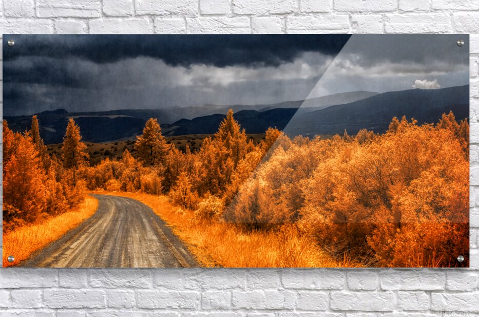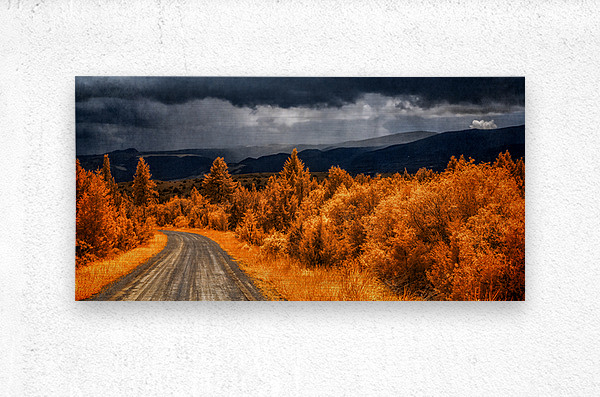 Embarking on the scenic descent from Elkhorn Montana a journey unfolds through the lens of Epic Descent: Montanas Infrared Mountain Road. This vibrant infrared capture transforms the road into a vivid passage illuminated by the radiant glow of nearby foliage painted in bright orange hues. As your gaze stretches into the distance the scene morphs into a dramatic theater of nature. Dark storm clouds swirl with textured intensity setting the stage for a mesmerizing play between light and shadow. The rolling mountains dressed in layers of infrared enchantment come alive as rain gently kisses their slopes. A focal point slightly off-center reveals a captivating interplay of thick clouds and diffused light creating an ethereal atmosphere that beckons exploration. This stunning image encapsulates the essence of Montanas diverse landscapes where every twist and turn on the mountain road reveals a new chapter in the unfolding drama of nature.