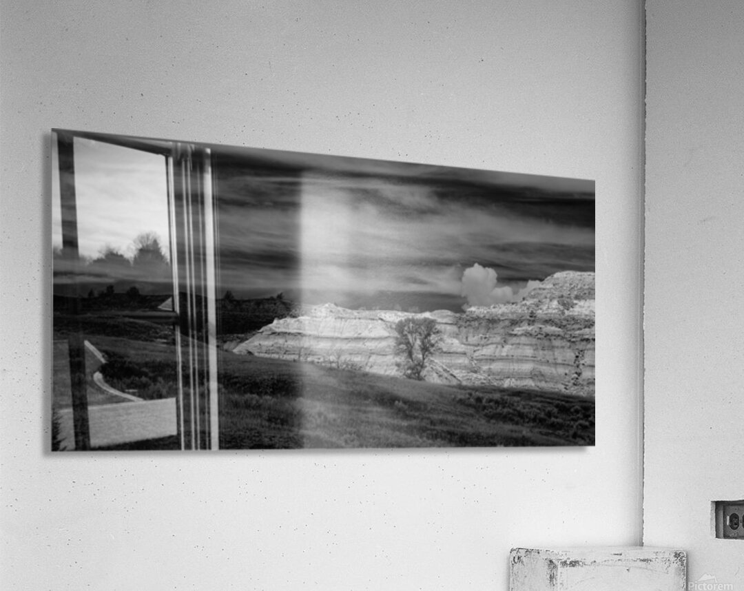In the remote reaches of Theodore Roosevelt National Parks North Unit ancient badlands formations rise like monuments to the patience of geological time their layered walls telling stories that span millions of years. This powerful black and white composition captures the raw majesty of these sedimentary sculptures where wind and water have carved masterpieces from stone with the precision of master artists. The lone cottonwood trees nestled among the formations provide scale and life to this ancient landscape while the dramatic sky above mirrors the undulating rhythms of the earth below. Here where Theodore Roosevelt first understood the profound connection between conservation and national character we witness the same timeless beauty that inspired a president to become Americas greatest champion of wild places. These are not just rock formations - they are cathedrals of stone temples to endurance and reminders that some things are too magnificent to lose.