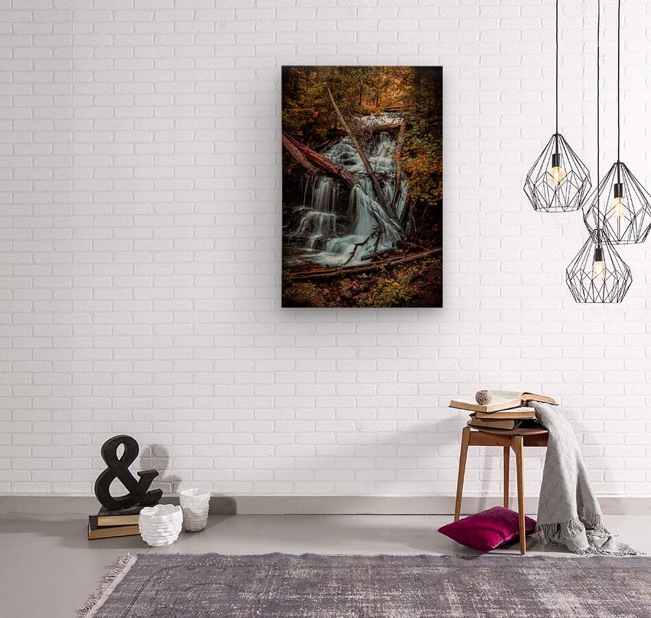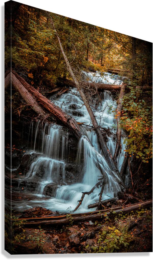 Surrounded by the golden tapestry of autumns peak display a magnificent waterfall cascades through the heart of the forest in a performance that celebrates the seasons most spectacular transformation. This stunning composition captures the magic that occurs when falls brilliant colors frame flowing water creating a scene where every element works in perfect harmony - the warm golds and oranges of changing leaves providing a glorious backdrop for the cool blues and whites of the multi-tiered cascade. Fallen logs create natural bridges and viewing platforms while the forest canopy glows with the inner fire that makes autumn legendary. Here in this moment of seasonal perfection we discover why waterfall photography reaches its peak during fall - not just for the colors but for the way autumn light transforms flowing water into something transcendent creating scenes so beautiful they seem to exist in a realm between reality and dream.