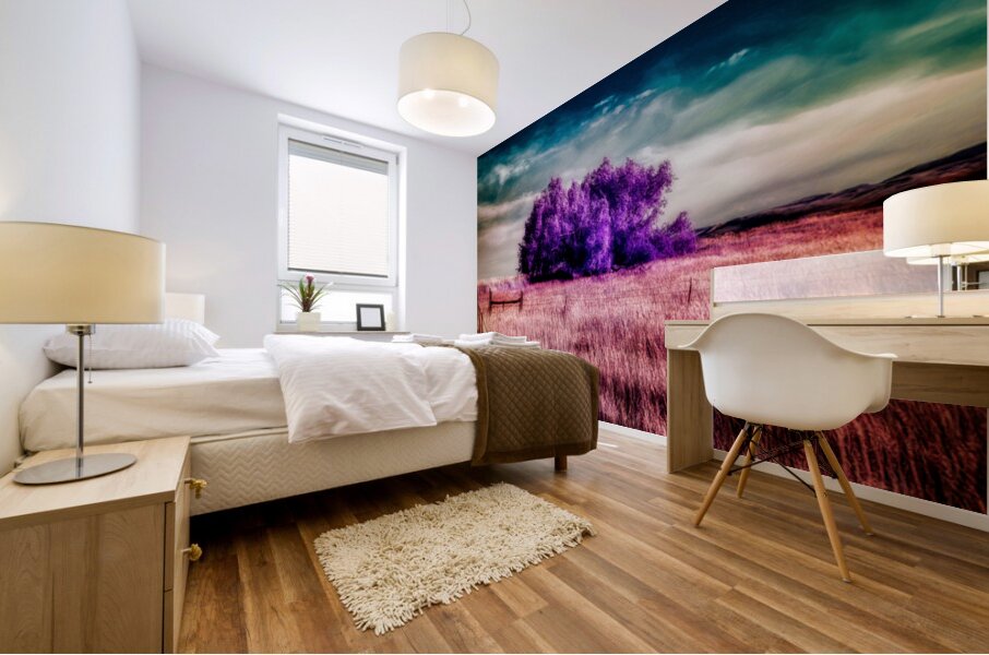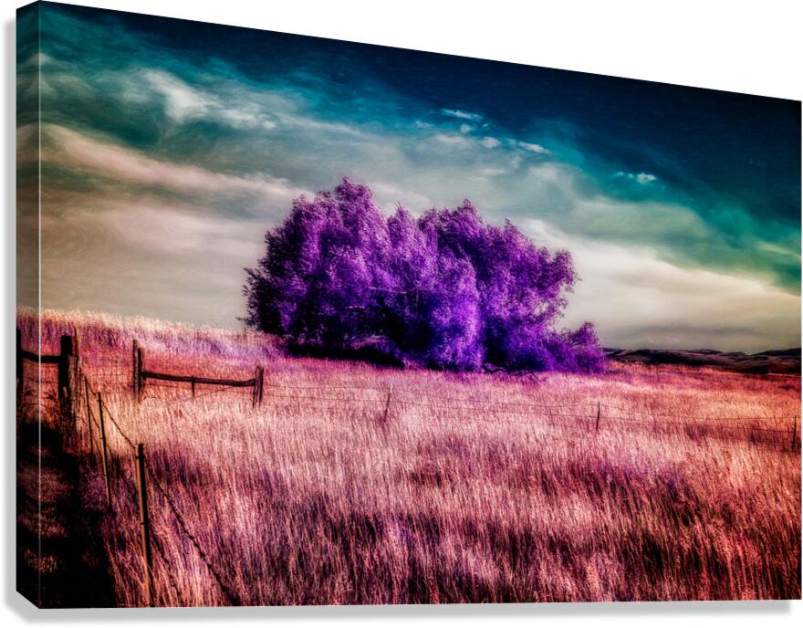 In the windswept prairies surrounding Lander Wyoming where sagebrush has weathered countless seasons beneath the endless sky infrared light reveals a hidden kingdom of amethyst wonder. This solitary grove stands like a jeweled crown in a sea of rose-gold grass its purple foliage transformed into something from a fairy tale. The weathered fence posts mark the boundaries between the known and the mystical while dramatic clouds gather overhead like ancient spirits watching over this sacred space. Here in the heart of Wyomings high desert natures secret palette emerges—a world where ordinary sagebrush becomes extraordinary where the familiar landscape transforms into a realm of pure enchantment.