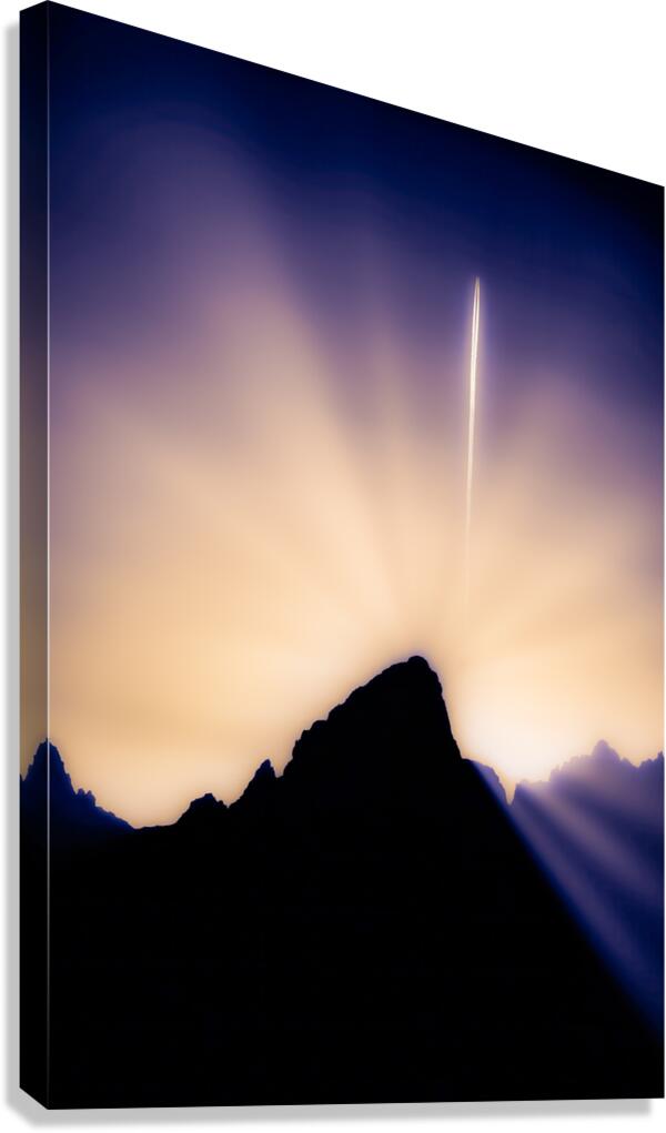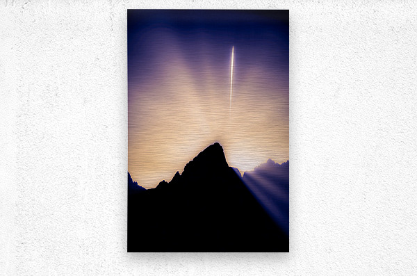 In the mystical realm where heaven touches earth a cosmic dance unfolds above the Grand Teton. Through infrareds ethereal vision we witness a moment when the veil between worlds grows thin - a jets contrail pierces the golden aurora of dawn like an arrow of light while the mountain stands as natures own temple below. The ancient ones spoke of mountains as the pillars of heaven of places where sky spirits would descend to commune with earth spirits. Here the Grand Teton becomes that sacred meeting point - its silhouette a dark altar against the luminous sky while rays of divine light cascade around its form like celestial waterfalls. The contrail above draws a straight line through the heavens as if marking a pathway for spiritual travelers between realms. In the traditions of many cultures mountains are seen as cosmic centers where human consciousness can rise to meet divine wisdom. This image captures such a moment - when natural light transforms into spiritual illumination when a simple contrail becomes a bridge between worlds when a mountain peak becomes a gateway to higher realms. Some say the most profound spiritual experiences happen when ordinary reality shifts into extraordinary revelation. In this sacred moment as light bends around stone and sky opens to infinity we witness that truth. This isnt just a mountain sunrise - its a glimpse into the thin places where physical and spiritual worlds merge in silent ceremony.