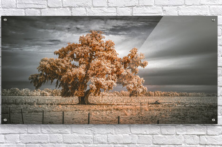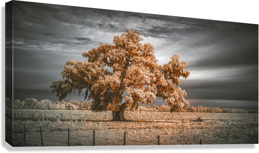 Rising from the Louisiana landscape like an ancient monument to the Deep Souths enduring soul this magnificent live oak draped in Spanish moss glows with copper fire against a moody sky that speaks of approaching storms and timeless mysteries. This breathtaking infrared composition captures the essence of Louisianas iconic tree - not just a plant but a living cathedral that has witnessed centuries of history unfold beneath its sprawling branches. The dramatic selective color treatment transforms the scene into something mythical where the warm amber tones of the oak and moss create a stunning contrast against the cool grays of the stormy sky while the surrounding pasture shimmers in silver light. Here in the countryside outside New Orleans where these ancient oaks have stood sentinel for generations we witness the tree that defines the South - gnarled graceful draped in natures own lace and burning with an inner fire that infrared photography reveals as the very life force of this legendary landscape.