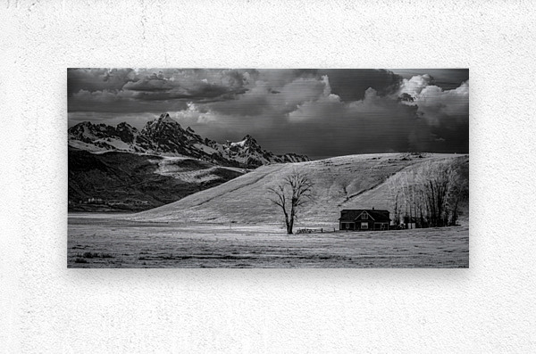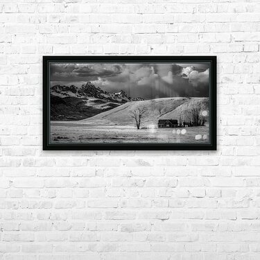 In the shadow of winter-touched peaks where mountains meet meadows I discovered this moment of perfect balance between wild and settled land. Through monochrome vision a solitary tree and humble homestead stand as quiet witnesses to natures grand theater where storm clouds gather above snow-dusted summits. The scene unfolds like a story written in light and shadow - a lone tree stands sentinel beside a rustic home their presence dwarfed by the magnificent Tetons rising beyond rolling hills. A simple rail fence traces its way across the snow-touched ground marking the delicate boundary between civilized space and wild country. Above dramatic clouds paint their own narrative across the winter sky adding depth to this tale of mountain living. Some say the truest stories of the American West are found in these quiet corners where human dwellings nestle into the feet of giants. On this day as storm light painted the landscape in infinite shades of grey I witnessed that truth. This isnt just a mountain scene - its a testament to those who choose to live in the embrace of these magnificent peaks.