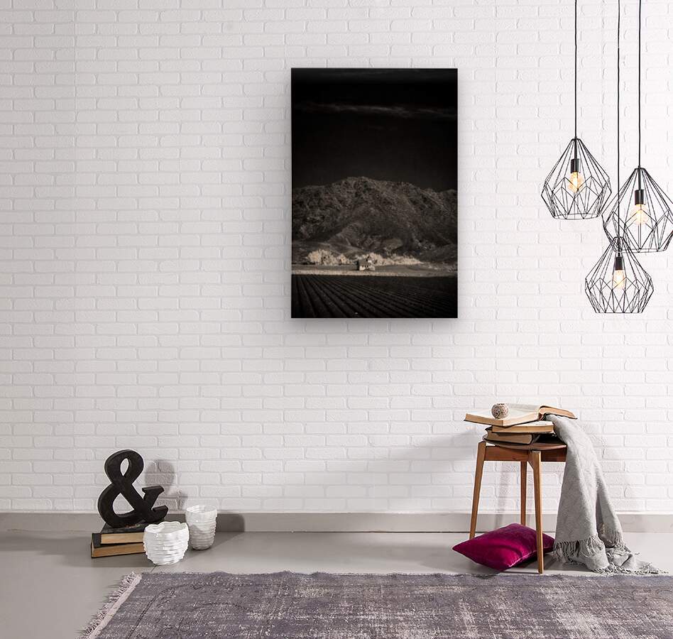 Church in Desert Tapestry enchants with its ethereal allure and depth. This black-and-white photograph leads viewers from the serene order of farm fields to the solitary charm of a lone structure. Beyond rugged mountains rise guardians of natures raw grandeur. The contrast between the ordered landscape and untamed peaks creates a harmonious tension inviting contemplation on humanitys dance with nature. A visual poem of wonder and introspection.