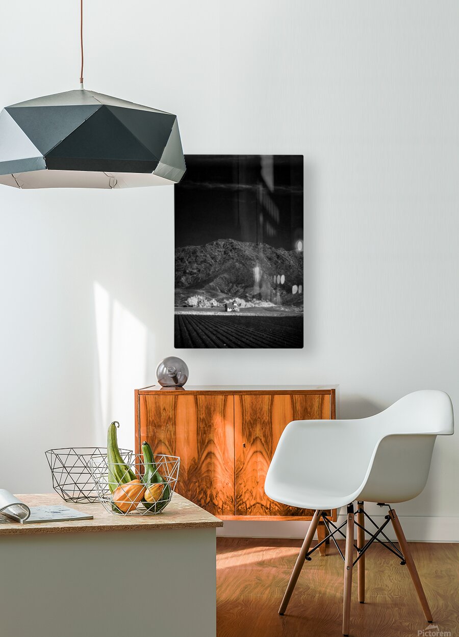 Church in Desert Tapestry enchants with its ethereal allure and depth. This black-and-white photograph leads viewers from the serene order of farm fields to the solitary charm of a lone structure. Beyond rugged mountains rise guardians of natures raw grandeur. The contrast between the ordered landscape and untamed peaks creates a harmonious tension inviting contemplation on humanitys dance with nature. A visual poem of wonder and introspection.