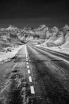 As Mays warmth embraced the Badlands my wife our loyal English pointer Cooper and I embarked on an exploration of South Dakotas mesmerizing landscapes. Every bend in the road revealed a new marvel and Infinite Ascent captures one such moment—an infrared road climbing a gentle slope seemingly ascending into a wall of rocks before gracefully veering right. This black and white image transforms the brilliant blue sky into a stark black thanks to the mystical touch of infrared light. The rocks intricately detailed stand as stoic witnesses to the passage of time and the beauty that nature unveils in this unique corner of the world. Named Infinite Ascent this photograph not only freezes a fleeting moment in the Badlands but also invites viewers to ponder the mysteries that await around the next turn in the road.