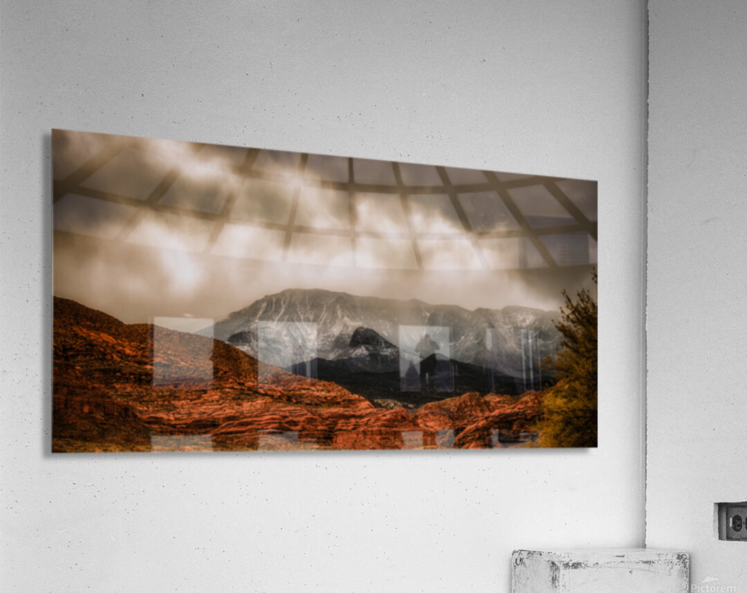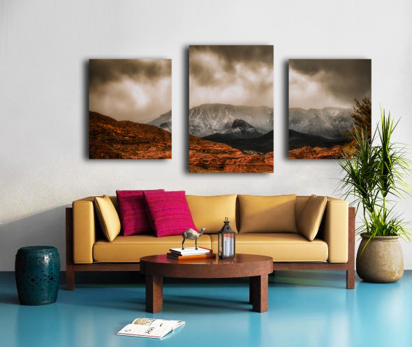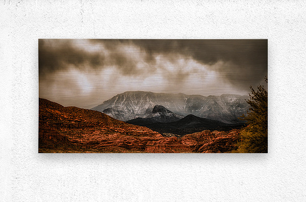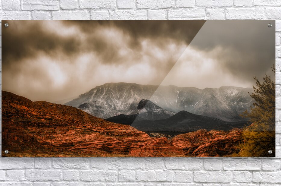 Where desert meets winter peaks nature creates its own theater of light and shadow. Red rock formations glow with warmth in the foreground while snow-dusted mountains pierce through dramatic storm clouds above. This capture freezes a moment where earth meets sky in a powerful display of Utahs diverse landscapes inviting viewers to witness the raw beauty of wilderness in transition.