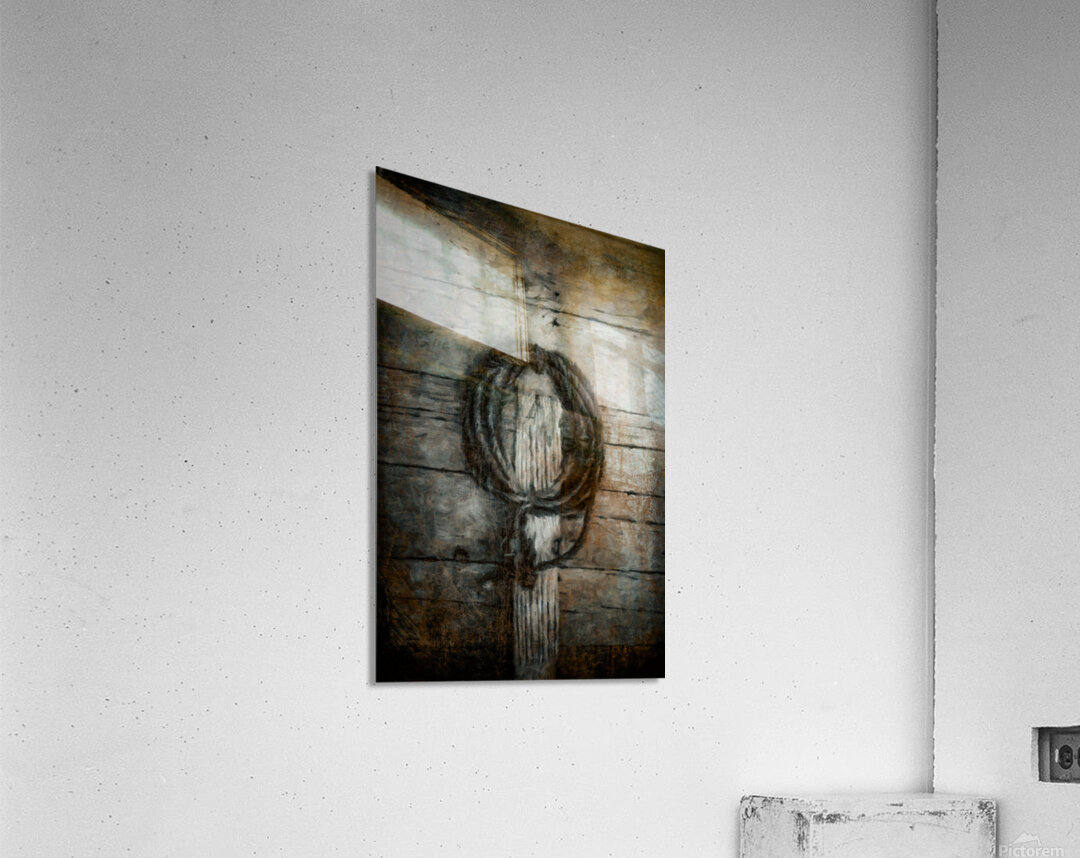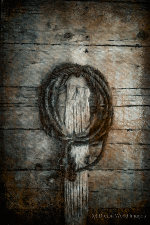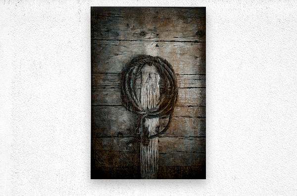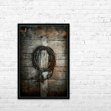 A coil of rope hangs in quiet patience against weathered boards like a simple spell tied in place. Time has softened the wood and darkened the fibers ...[+]