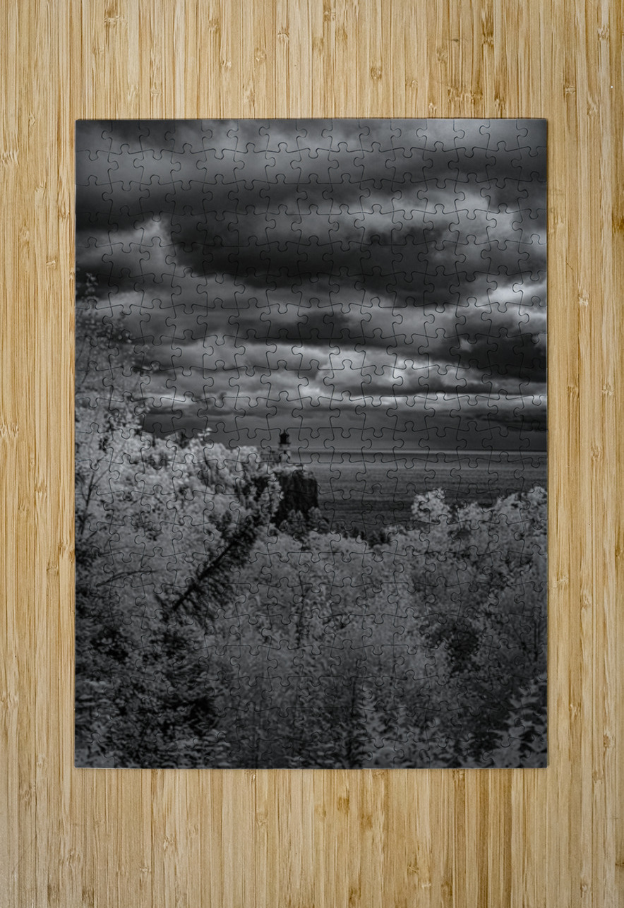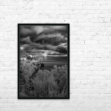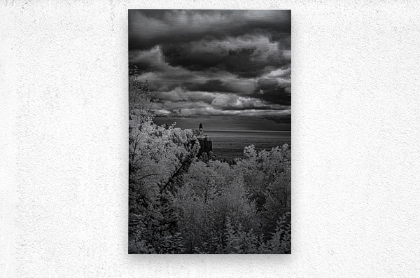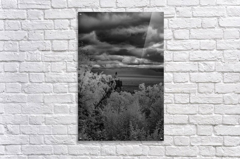 Perched majestically on its volcanic cliff above Lake Superior Split Rock Lighthouse stands as Minnesotas most iconic symbol of maritime heritage and natural beauty. This dramatic black and white infrared composition captures the legendary lighthouse in all its timeless glory surrounded by luminous forest that seems to glow with its own inner light under stormy skies that speak of the Great Lakes legendary power. Built in 1910 after a devastating storm claimed numerous ships this beacon has guided countless vessels safely through treacherous waters its light cutting through fog and darkness for over a century. Here where the North Shores rugged beauty meets human ingenuity and determination we witness more than just a lighthouse - we see a symbol of hope resilience and the eternal human desire to provide safe harbor for those navigating lifes storms. This is Split Rock as it truly exists - not just as a tourist destination but as a living monument to the courage and vision that built Americas maritime legacy.