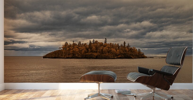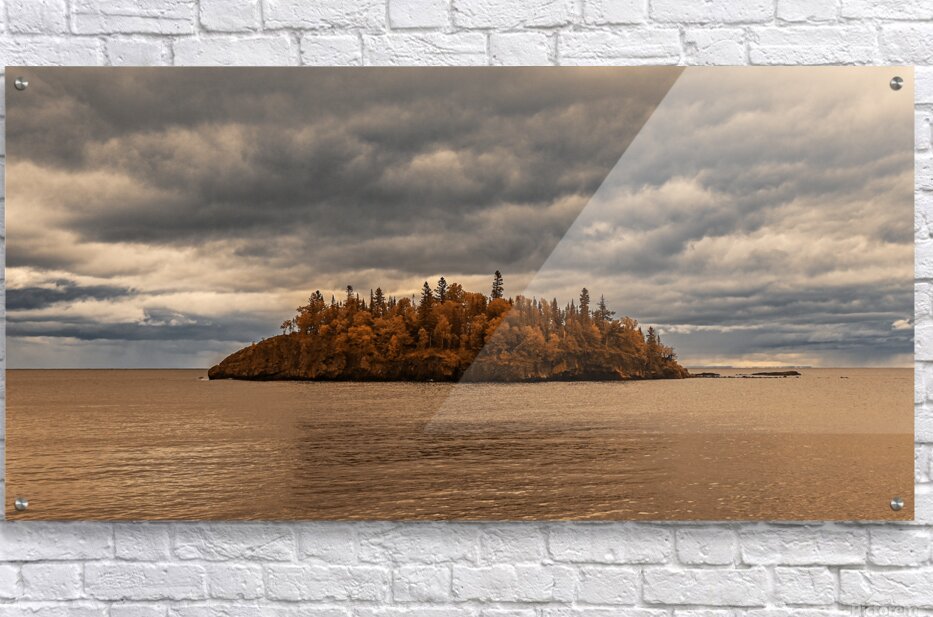 In the warm embrace of autumns golden hour a forested island in Lake Superior glows like a jewel set in liquid bronze crowned with the spectacular colors of Minnesotas North Shore fall season. This breathtaking composition captures the magic that occurs when perfect light meets perfect timing - where the islands maple birch and aspen trees burst into flames of gold and amber while the great inland sea reflects this celestial display in its mirror-smooth surface. The dramatic sky creates a theater of clouds that seems to celebrate this moment of peak autumn beauty when the North Shore transforms into natures own gallery of living art. Here where the endless waters of Lake Superior cradle this floating forest we witness one of the most spectacular seasonal displays in North America - a reminder that some beauty is so profound it stops time itself creating moments of wonder that live forever in memory and heart.
