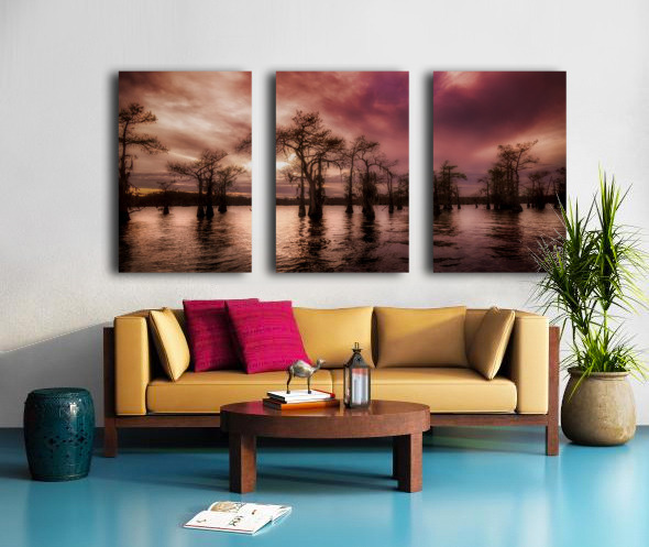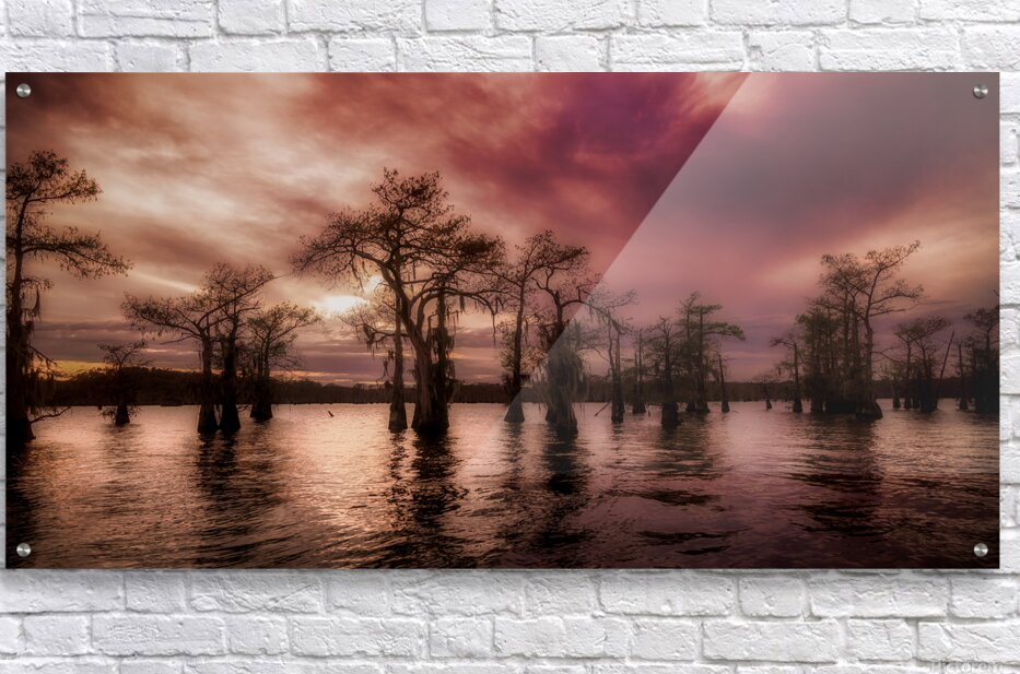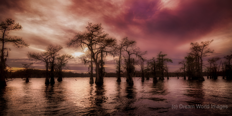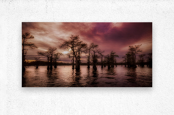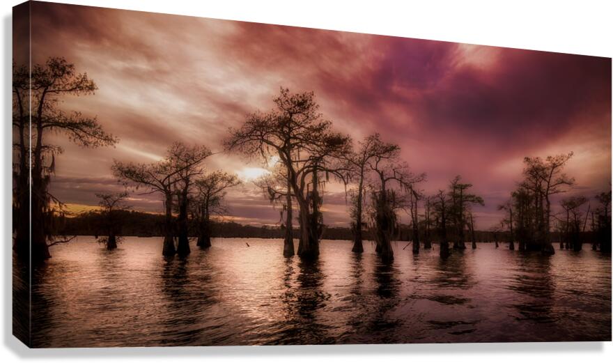 There are evenings at Caddo Lake when the sky forgets its usual palette and reaches instead for something rarer—shades of lavender and rose deep purples bleeding into soft pinks the whole horizon glowing with a light that feels borrowed from dreams. On such nights the cypress trees stand in perfect silhouette their forms dark and graceful against the radiant backdrop while the water below captures every nuance of color and reflects it back doubled and deepened. This is the hour when the swamp holds its breath. The Spanish moss hangs motionless each strand a delicate line against the luminous sky. The water is glass-smooth disturbed by nothing offering up a mirror so perfect it becomes impossible to say where the real world ends and the reflection begins. The trees ancient and patient have witnessed countless sunsets just like this one yet each feels singular unrepeatable as though the sky is performing just for them. There is a tenderness to this light a softness that invites contemplation rather than awe. The colors are not aggressive they do not demand attention. Instead they settle gently over the landscape wrapping the cypress trees in a glow that feels almost protective almost sacred. And for those fortunate enough to witness this moment the message is clear: beauty does not always arrive with fanfare. Sometimes it comes quietly in shades of purple and pink in the last whisper of twilight before the world turns dark.