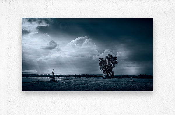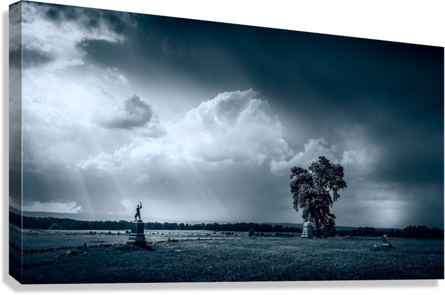 Venturing onto the hallowed grounds of Gettysburg Battlefield during a tempestuous storm stirred my soul and ignited my senses. As I braved the elements camera in hand I sought to capture the raw beauty and profound history that permeate this sacred place. After the raging storm rolled past I stumbled upon a scene that seemed plucked from the annals of time—a monochromatic landscape that spoke volumes of the past and present. The sky above churned with ominous clouds their darkened depths contrasted by ethereal sunbeams piercing through casting an otherworldly glow upon the scene. Beneath this celestial display a pastoral expanse unfolded stretching into the horizon with an air of timeless serenity. At its heart stood a solemn figure its raised arm a silent testament to the sacrifices made on these hallowed grounds. It was a monument a beacon of remembrance amidst the tranquil chaos of natures fury. Clusters of trees topped the statue their steadfast presence grounding the composition and adding depth to the vast expanse before me. Despite the storms ferocity a profound sense of peace enveloped the scene a reminder of the enduring resilience of both nature and history. As I captured this moment in time through my lens I couldnt help but feel a deep reverence for the spirits that still lingered within these fields. It was a reminder of the indomitable human spirit and the enduring majesty of nature entwined in a timeless dance of tranquility and turmoil.