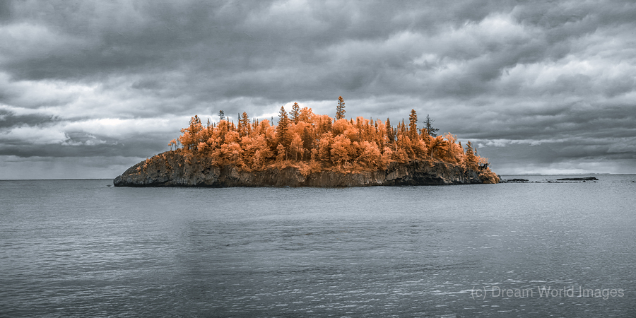 Rising from the steel-blue waters of Lake Superior like a jewel set ablaze this forested island glows with the impossible fire of infrared autumn unde...[+]