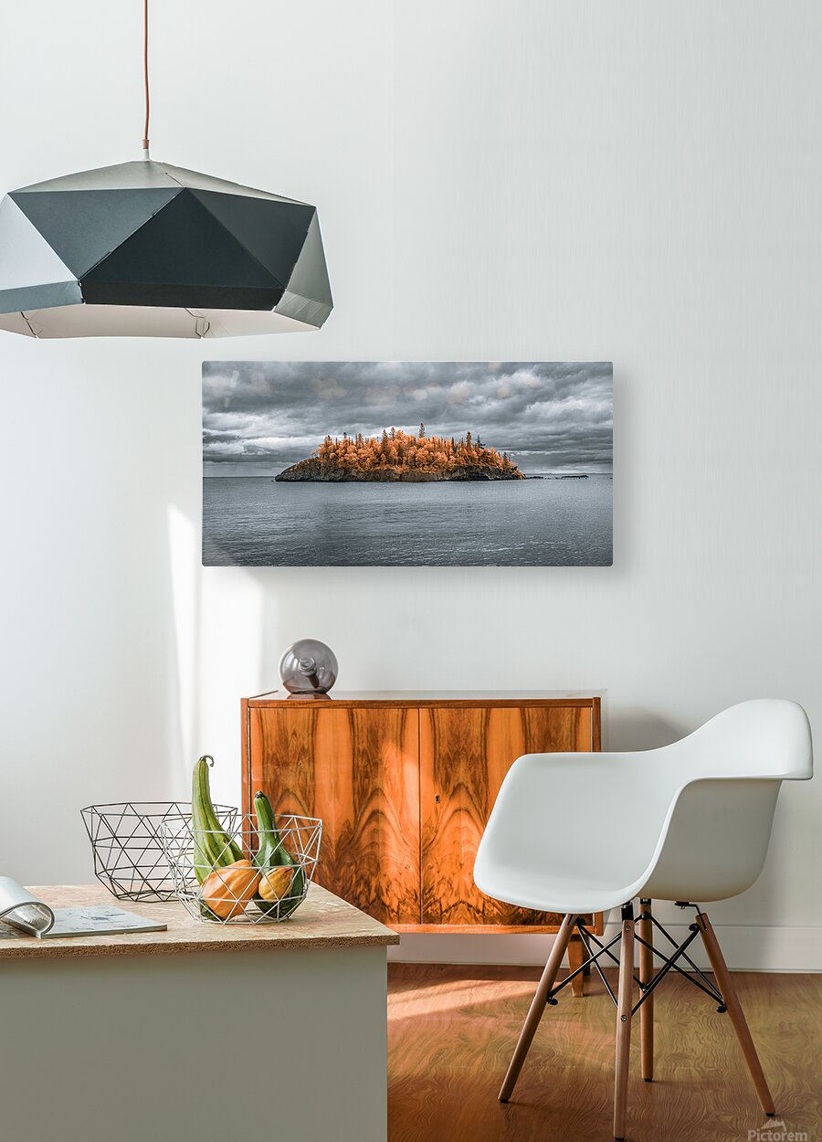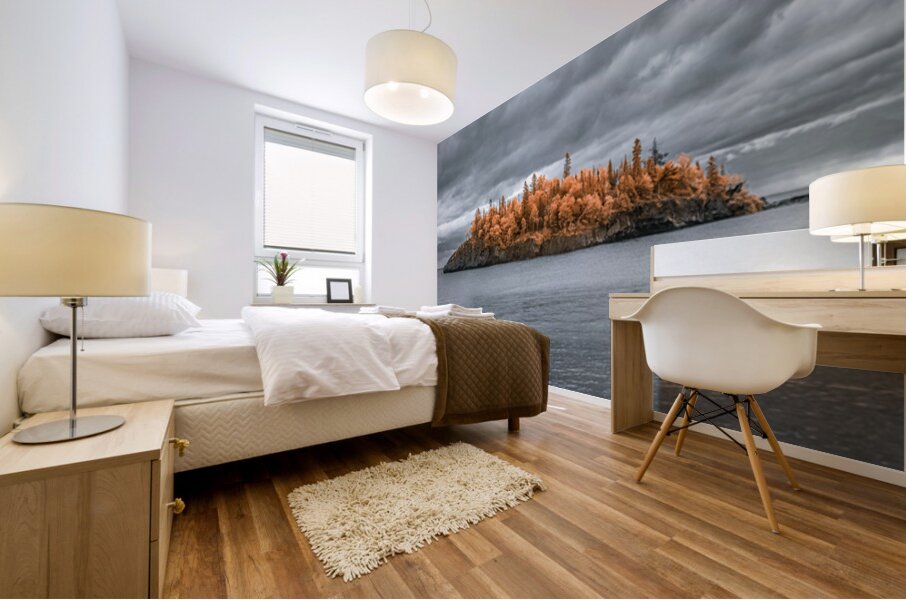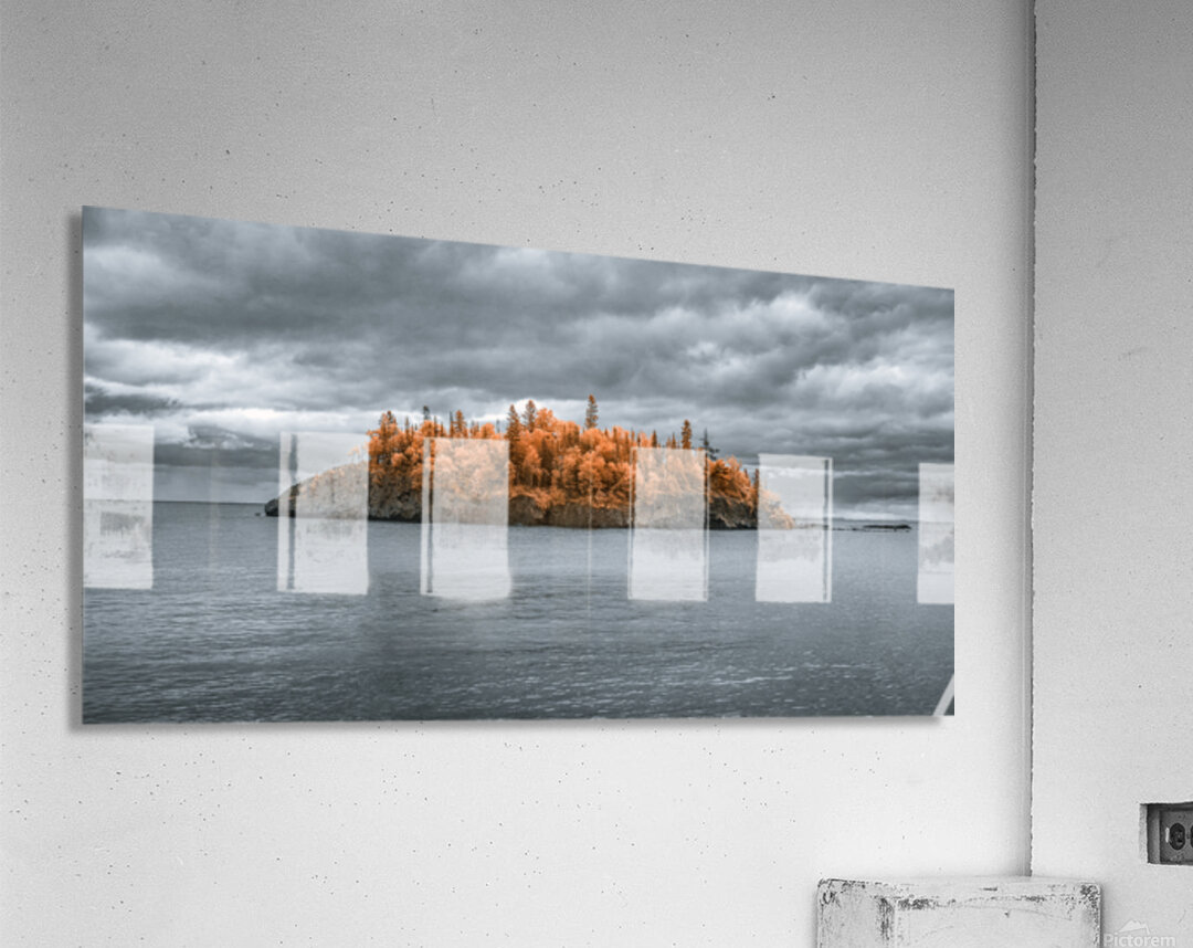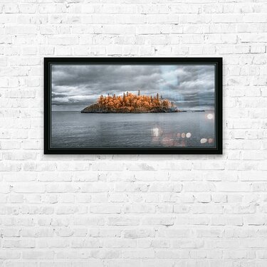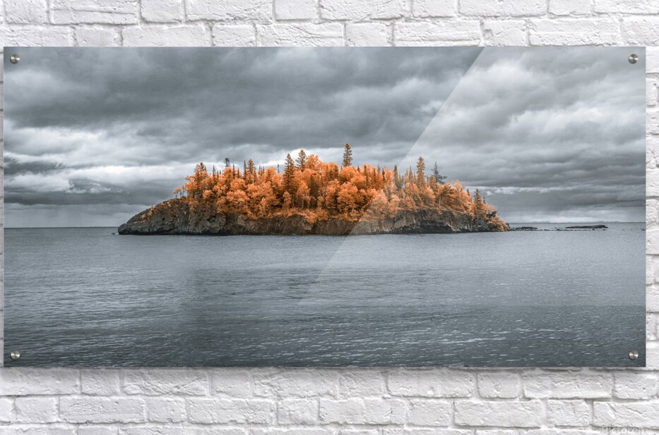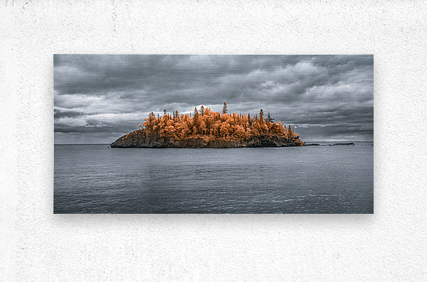 Rising from the steel-blue waters of Lake Superior like a jewel set ablaze this forested island glows with the impossible fire of infrared autumn under a sky heavy with gathering storms. This breathtaking composition captures one of natures most dramatic contrasts - where the warm copper and gold tones of fall foliage intensified through infrared photography create a stunning counterpoint to the cool blues and grays of the great inland sea and its moody sky. The island crowned with ancient conifers and deciduous trees in their seasonal glory seems to burn with an inner light against the threatening darkness above as if defying the storms approach with its own brilliant display of life and color. Here where Lake Superiors endless waters cradle this floating forest we witness the magic that occurs when infrared vision reveals the hidden energy of autumn - transforming familiar fall colors into something that transcends the ordinary and touches the realm of dreams creating a scene so vivid it seems almost unreal yet captures a truth about natures beauty that normal vision can never quite perceive.