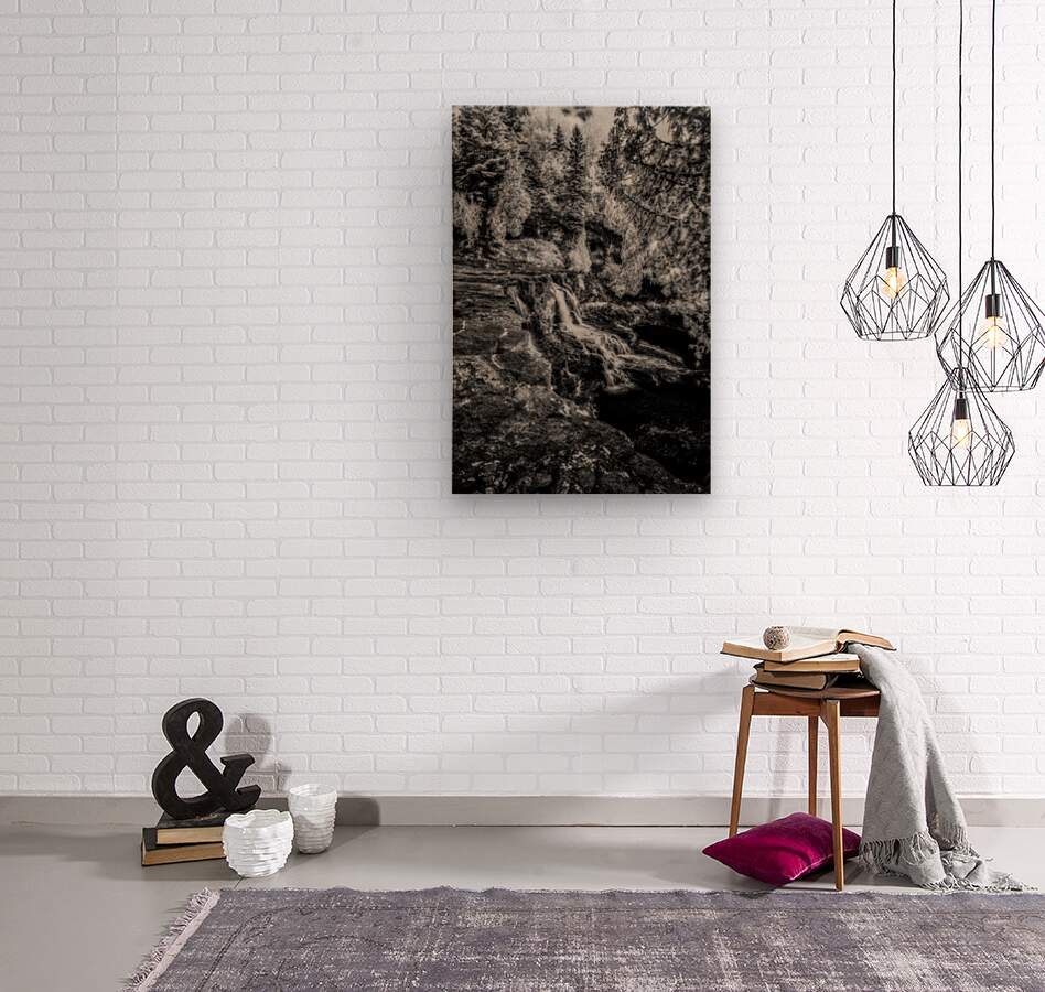 Deep within Minnesotas North Shore wilderness where ancient volcanic rock meets the patient flow of woodland streams a hidden waterfall creates its own cathedral of stone and silver. This ethereal black and white composition captures the intimate beauty of the North Woods - not the grand spectacle of famous falls but the quiet majesty of water finding its way through a landscape that seems touched by moonlight even in daylight. The luminous forest surrounds this secret sanctuary while multiple tiers of cascading water create veils of mist that soften the ancient bedrock into something almost dreamlike. Here in this hidden corner of the wilderness we discover the gentle soul of Minnesotas North Shore - where every stream tells a story every rock holds memory and the forest itself becomes a living temple to the enduring power of water stone and time working together in perfect harmony.