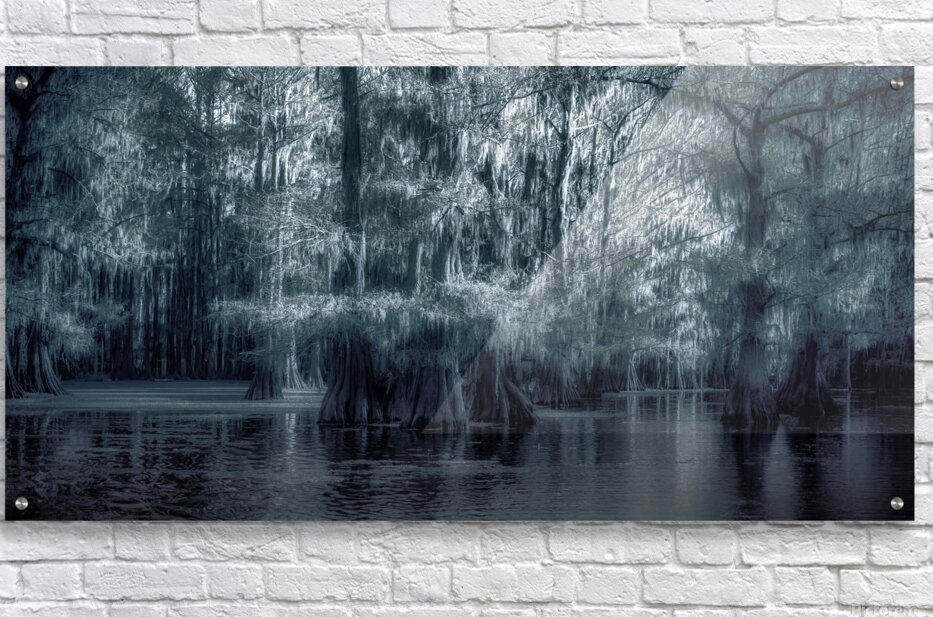 Neither day nor night neither water nor sky—this is the hour when dimensions touch. The cypress trees stand as gatekeepers their roots in one world their branches in another. In this blue-gray liminal space time moves differently. Or perhaps it doesnt move at all.