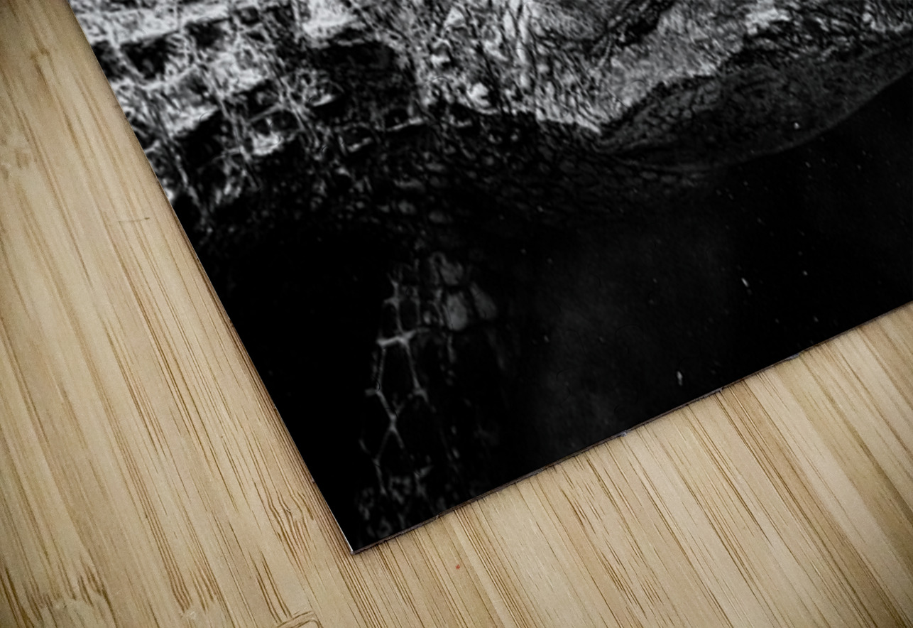 Up close the alligator feels less like an animal and more like an artifact—armored plates weathered skin and an eye that looks like it’s been watching the same water for a very long time. The surface around it is dark and quiet broken only by pale stone shapes beneath and a few drifting specks that read like dust in a beam of light. In black and white the textures take over: every ridge and scar becomes part of the story and the stillness becomes its own kind of power. This is the Everglades’ version of royalty—no crown no noise just patience and presence.