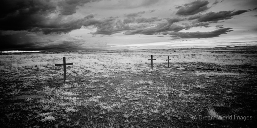 As I embarked on my journey to Fort Laramie in Wyoming, I was captivated by the haunting beauty of the landscape surrounding me. Before I stretched a scene of somber solemnity, where rugged wooden crosses stood in stoic silence, each bearing the weight of untold stories and forgotten history. In the foreground, one cross stood prominently centered, its weathered surface a testament to the passage of time and the mysteries of mortality. Behind it, two additional crosses rose from the barren earth, adding depth to the desolate landscape that stretched before me. The ground beneath my feet was rough and barren, scattered with tufts of grass that seemed to cling to life against all odds. Above, the sky hung heavy with textured clouds, casting a foreboding shadow over the scene below and hinting at the unseen forces at play. As I gazed upon the silent crossings that dotted the landscape, I felt a sense of reverence wash over me. Each cross seemed to tell a story of its own, a tale of loss and remembrance that echoed through the vast emptiness of the setting. This haunting and evocative scene invited me to contemplate the deeper meanings hidden within its solemn beauty. It spoke of abandonment, memory, and the passage of time. At the same time, the vastness of the landscape hinted at the isolation and forgotten history that surrounded me. As I stood there, surrounded by the silent crossings of Fort Laramie, I couldn't help but feel a sense of awe at the somber beauty that lay before me. It was a moment of quiet contemplation, a chance to reflect on the mysteries of life and the enduring power of memory.
