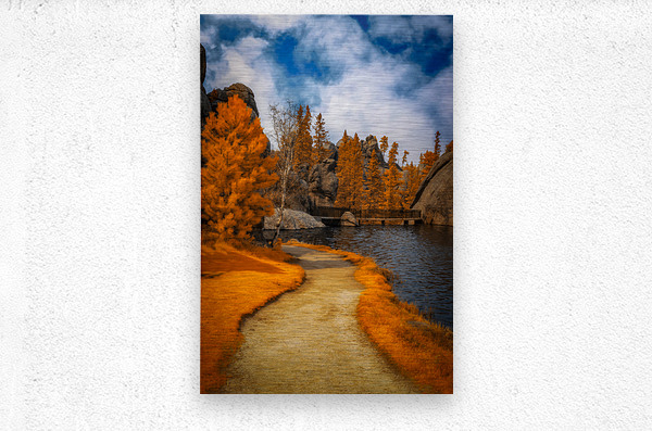 Under the embrace of a beautiful sunny day at Sylvan Lake in Custer State Park, South Dakota, my wife and I reveled in the enchanting surroundings. Each turn around the lake unveiled new opportunities to capture the essence of this remarkable landscape. This particular image, titled 'Autumnal Serenity: Sylvan Lake Path,' paints a scene along the lakeside trail. The infrared treatment transforms the sky into a vivid blue, complementing the burnt orange hues of the trees. Strolling along the path, we encountered large boulders, a charming bridge, and a picturesque overlook across the narrow part of the lake. The trail winds gracefully behind a striking dead tree, adding an intriguing element to the composition. 'Autumnal Serenity' invites viewers to immerse themselves in the serene beauty of Sylvan Lake, where the path unfolds amidst nature's vibrant display of colors.