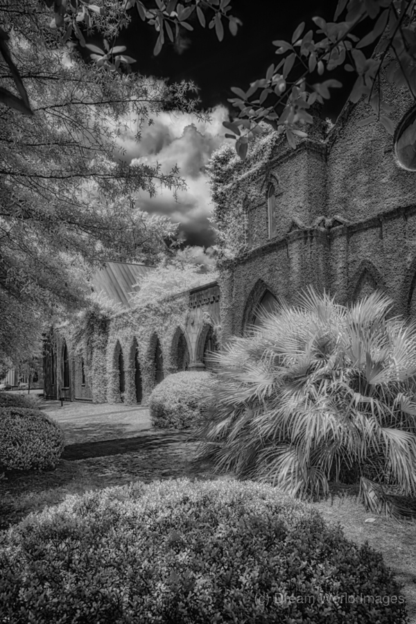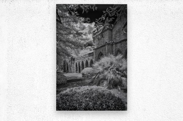 Immerse yourself in the timeless allure of St. James Episcopal Church in the heart of Eufaula, Alabama, unveiled through the lens of a captivating black and white infrared photograph. This visual journey transcends the ordinary, inviting you into an enchanting embrace where the very soul of the church is laid bare. The ivy-covered walls, adorned with intricate details, become a living canvas as they gracefully unfold in monochromatic splendor. Each tendril of ivy tells a story, weaving a tapestry of textures that adds an ethereal elegance to the scene. The play of light and shadow accentuates the architectural nuances, bringing forth the church's history and character in a silent visual symphony. In the foreground, a small bush stands as a humble yet significant presence, contributing to the composition with its delicate silhouette. Against the stark black sky, a dramatic backdrop unfolds, serving as a canvas that accentuates the ethereal beauty of St. James Episcopal Church. The dark expanse magnifies the intricate details, creating a chiaroscuro effect that heightens the overall atmospheric impact. Nature, seemingly with artistic intent, positions the surrounding trees to frame the entrance of the church. Their branches extend like welcoming arms, adding a touch of mystique to this atmospheric portrayal. The juxtaposition of natural elements against the architectural grandeur creates a harmonious balance, transforming the photograph into a visual poem. As you step into this enchanting visual narrative, the very spirit of St. James Episcopal Church comes alive. The black and white infrared treatment not only captures the physical form of the church but also reveals its intangible essence. It becomes a portal into a realm where time seems to stand still, and the delicate dance of light and shadow narrates the sacred stories etched within the hallowed walls.